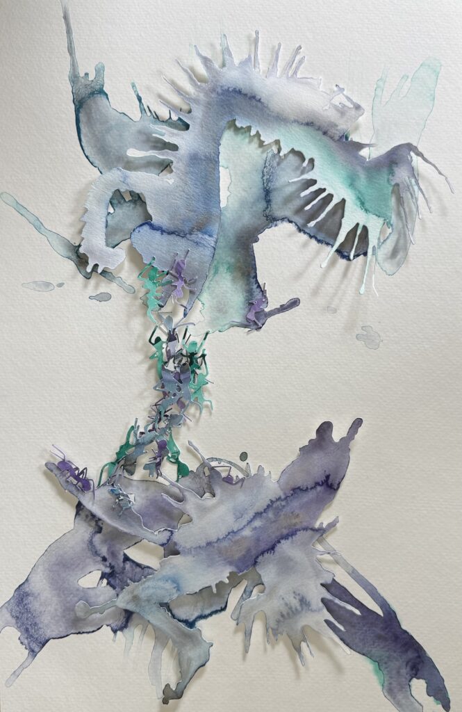 I begin by looking to the natural world for structures of care murmuration’s, root systems, ant colonies, shoals of fish—patterns that reveal how living things move, think, and survive together. Those formations become visual metaphors for the ways humans also depend on one another, even when we forget. I often incorporate faces or hands within these larger formations, almost like they’re emerging from the collective. Faces hold so much of our humanity, and hands are symbols of reaching, offering, and being in relation. The work becomes a meeting point between the ecological and the human neither one overtaking the other. I’m asking viewers to notice themselves inside these systems, not outside them. If someone sees a face within a flock of paper birds, or a hand support an ant bridge, it’s a gentle reminder: the way we care for each other is part of the same network that holds the forest, the ocean, and the sky.