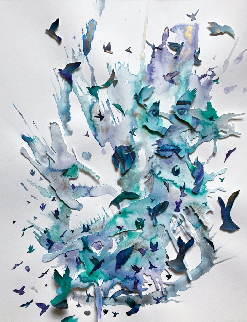 What’s striking isn’t just her commitment to metaphor, it’s her refusal to let metaphor stay abstract. She takes the lessons nature teaches us about survival, care, and interdependence, and she translates them into visual language that forces us to confront our own isolation. When you see a face emerging from a flock of birds, it’s not poetic for poetry’s sake. It’s a mirror. It’s asking: Where do you see yourself in this system? Are you participating in care, or pretending you can exist outside of it?