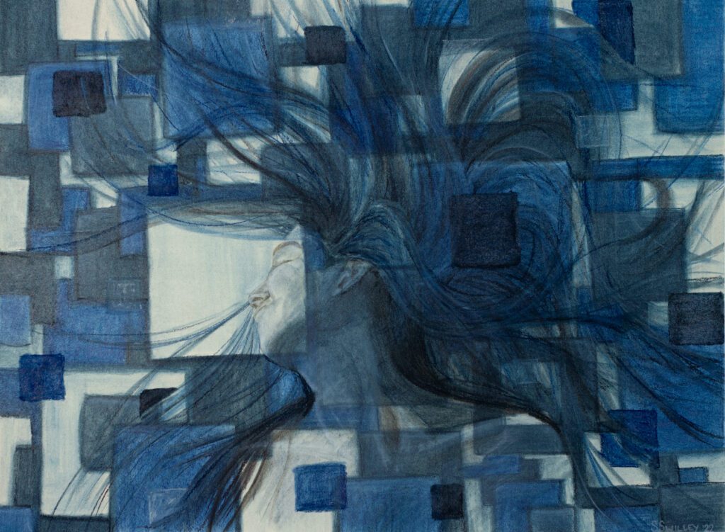 Stephanie Swilley lives in Northern Iowa and describes herself as community taught, a term that feels truer than any formal label. She didn’t learn art by sitting in classrooms. She learned it by watching how roots tangle underground, how whales protect their pods, how starlings move like one mind. She learned from books, poetry, and the people around her. She learned by paying attention to the systems that hold us together and the ones that tear us apart.