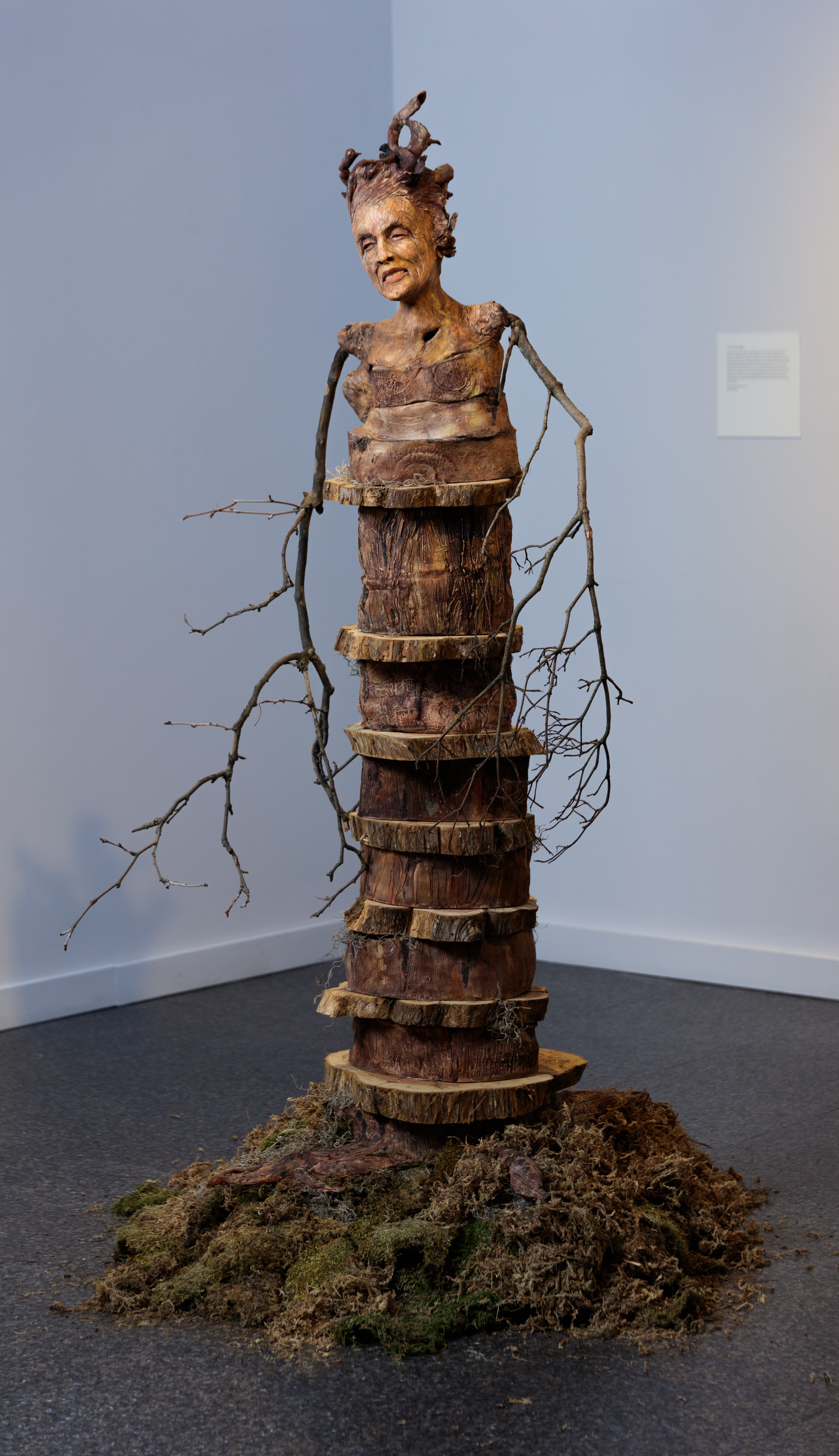 Forest Dweller, 2025, 5″7″ x 30″ x 40″, Stoneware Paper Clay, Tree Bark, Tree Branches, Moss on Steel Armature