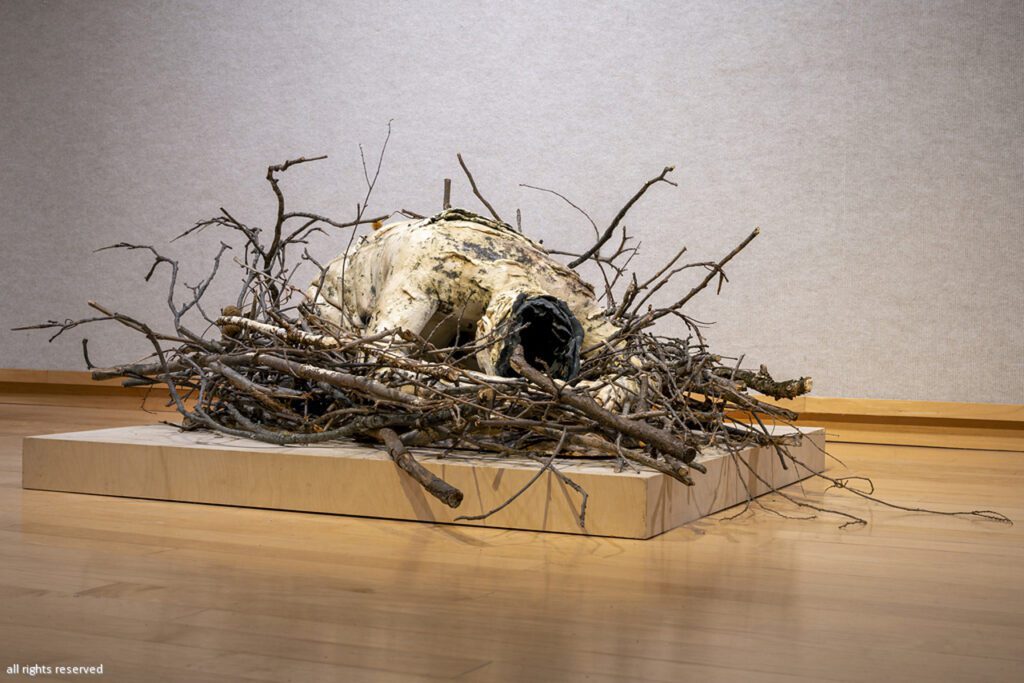 Truth from Within, 2016/2024, 25″ x 40″ x 20″, Stoneware Paper Clay, Stains, Wax, Wire, Tree Branches