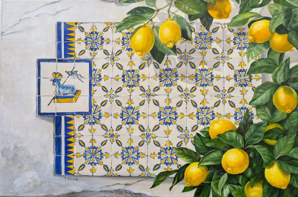Lemon branch on azulejo wall. 2025. 60x90x3 cm. Canvas. Oil