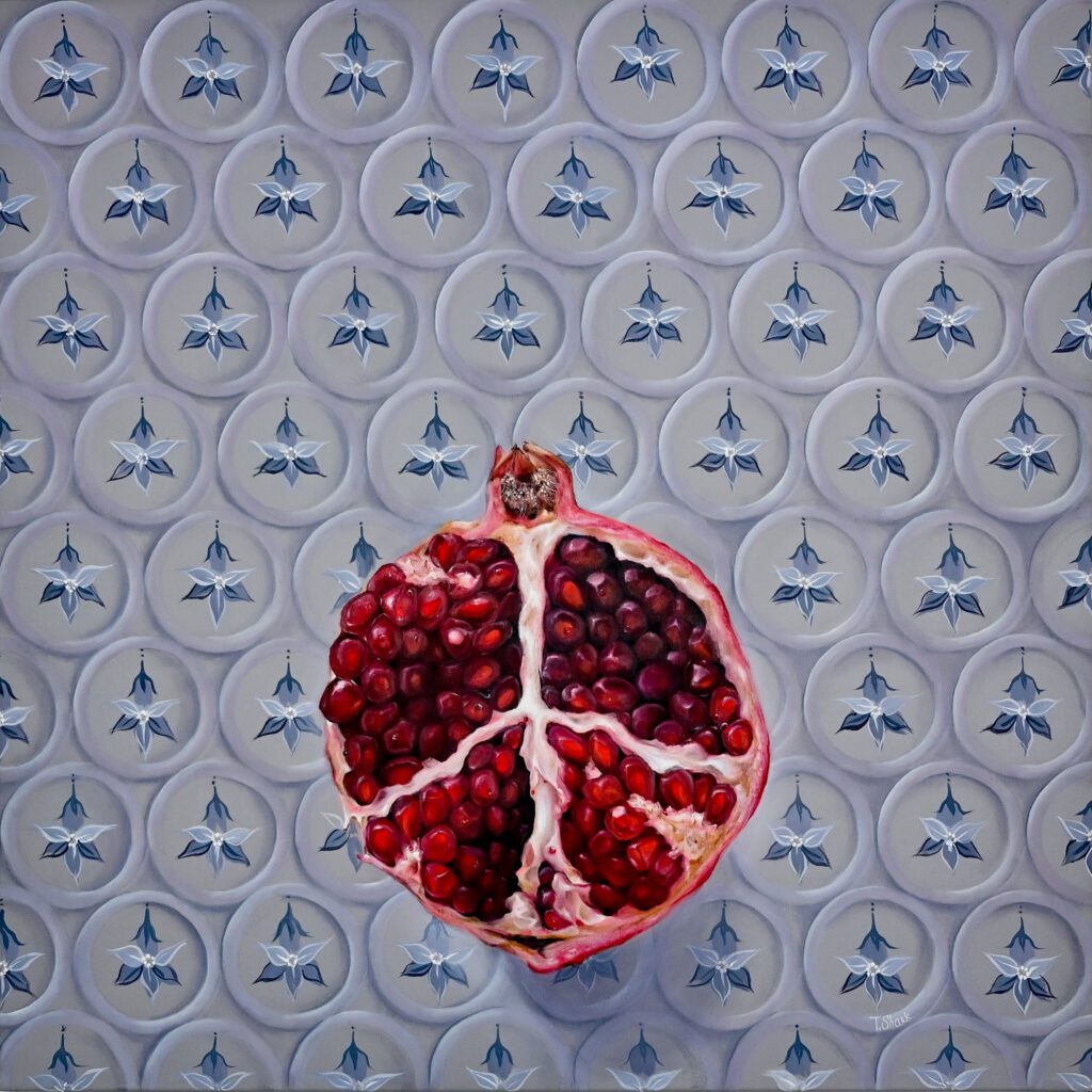 Pomegranate on ajulejo. 2023. 70x70x2 cm. Canvas. Oil.