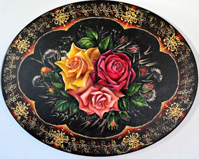 Roses on a tray. 2023. Oval 40x50x2 cm. Canvas. Oil
