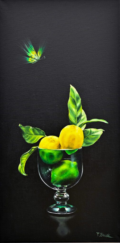 lemons in a green vase. 2024. 60x30x2 cm. Canvas. Oil