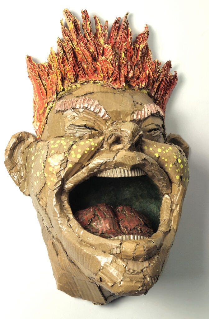 Q4. Your current sculpture work frequently uses cardboard and repurposed paper. What drew you to use materials that are often seen as lowly or throwaway, and what do they allow you to express?