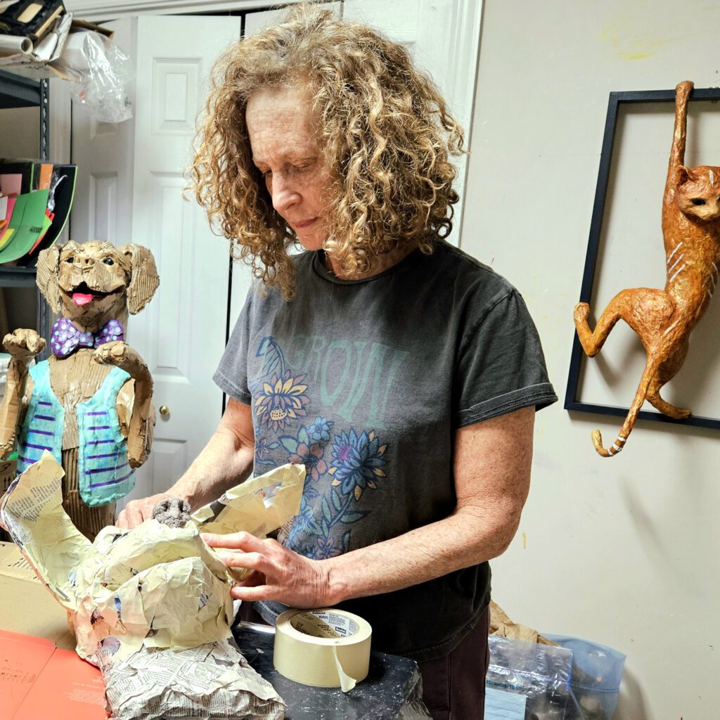 She’s a sculptor who works with cardboard, paper, and wood, building forms through layering and shaping and adding colour with the kind of care and craftsmanship you’d expect from someone working in bronze. Because that’s her training.