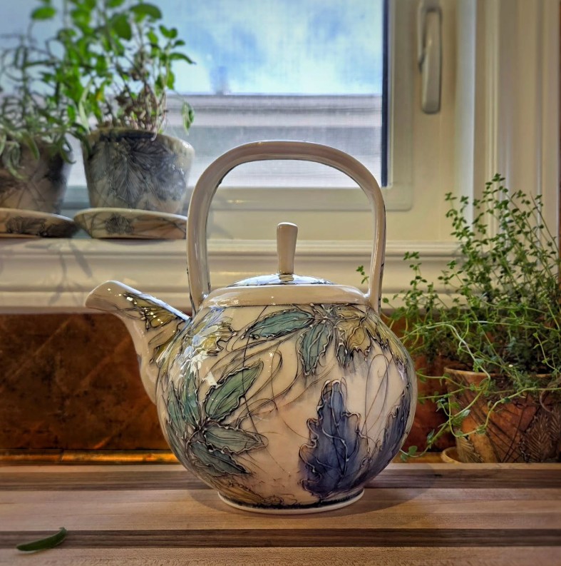 Her pieces often start from time spent paying attention to the land and seasons around her. She works with patterns, small marks and repeating forms, building surfaces that feel calm and thoughtful. Many of her pots carry traces of the prairie environment she lives in, whether through colour choices, leaf impressions or quiet rhythmic lines. The work is meant to be handled and used, and it carries a gentle sense of care for everyday routines.