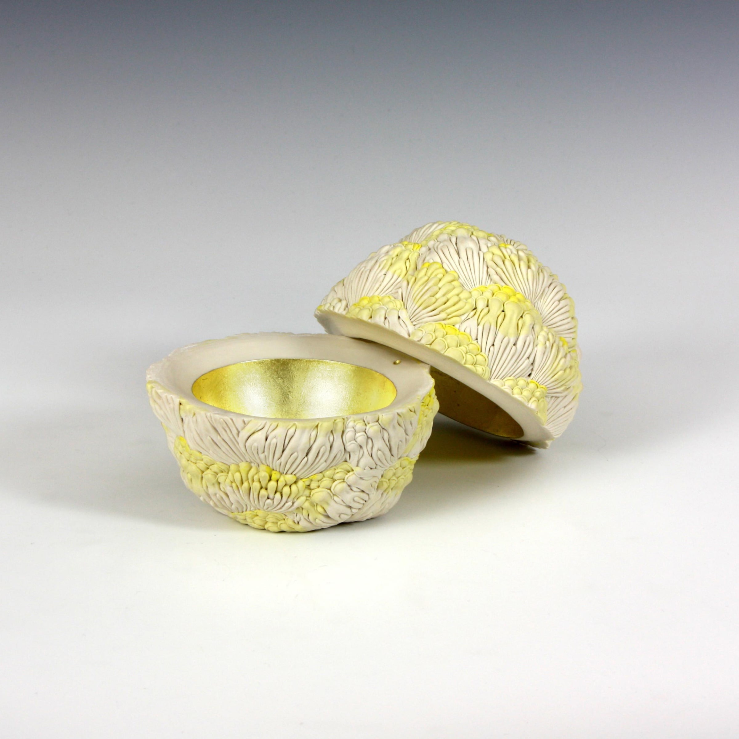 Her surfaces have a quiet, chalk-like presence, sometimes finished with gold inside bowls or boxes, giving small pieces an almost jewel-like quality. Her dedication to detail has drawn the attention of major museums, including the British Museum and the Victoria and Albert Museum, both of which hold her work.