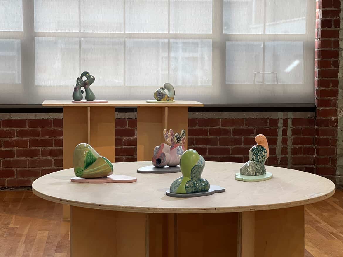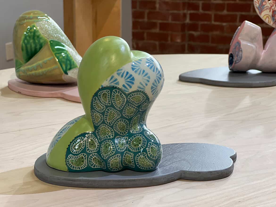 Erin B. Furimsky’s sculptures carry the feeling of something growing slowly across a surface, the way patterns in nature gather themselves without losing their sense of structure. She builds her forms by hand, often beginning with shapes that hint at domestic objects, then shifting them through pressure, carving and the steady addition of small elements. The surfaces accumulate floral suggestions, lace-like geometry, tiny cellular marks and loose linework that settle together into a steady rhythm of color and pattern.
