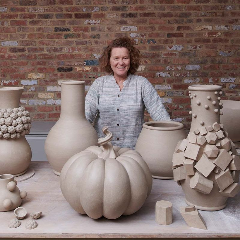 Kate Malone MBE has spent more than three decades working with clay, and her energy for the material is easy to see in everything she does. After studying at Bristol Polytechnic and the Royal College of Art, she began building a career that now spans studio work, public commissions, and a long pursuit of glaze chemistry. She works from two studios, one in Kent and another in London, where shelves hold years of glaze tests and experiments.