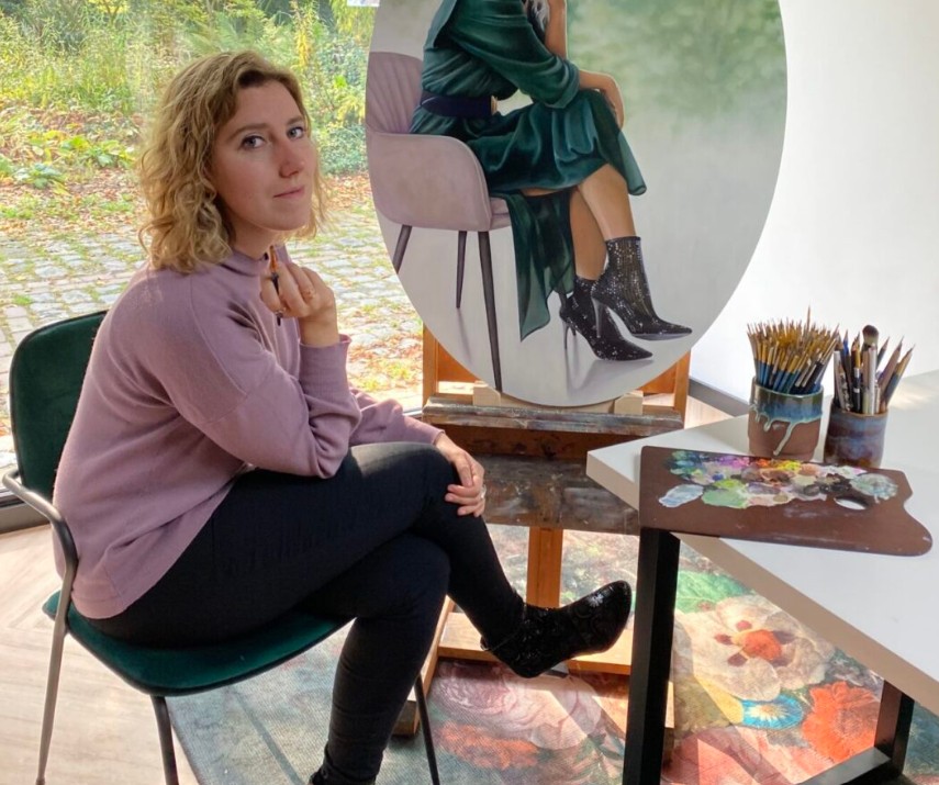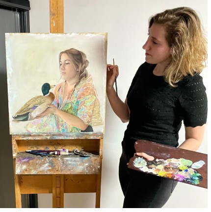 Her paintings begin with a careful black and white underdrawing, followed by several transparent layers of oil applied gradually over time. This method creates a smooth surface and allows light to move gently through the layers of paint. Her work Grandpa brought her wide recognition after winning the Young Talent Award at the Dutch Portrait Prize in 2019, and marked an important moment in her career.