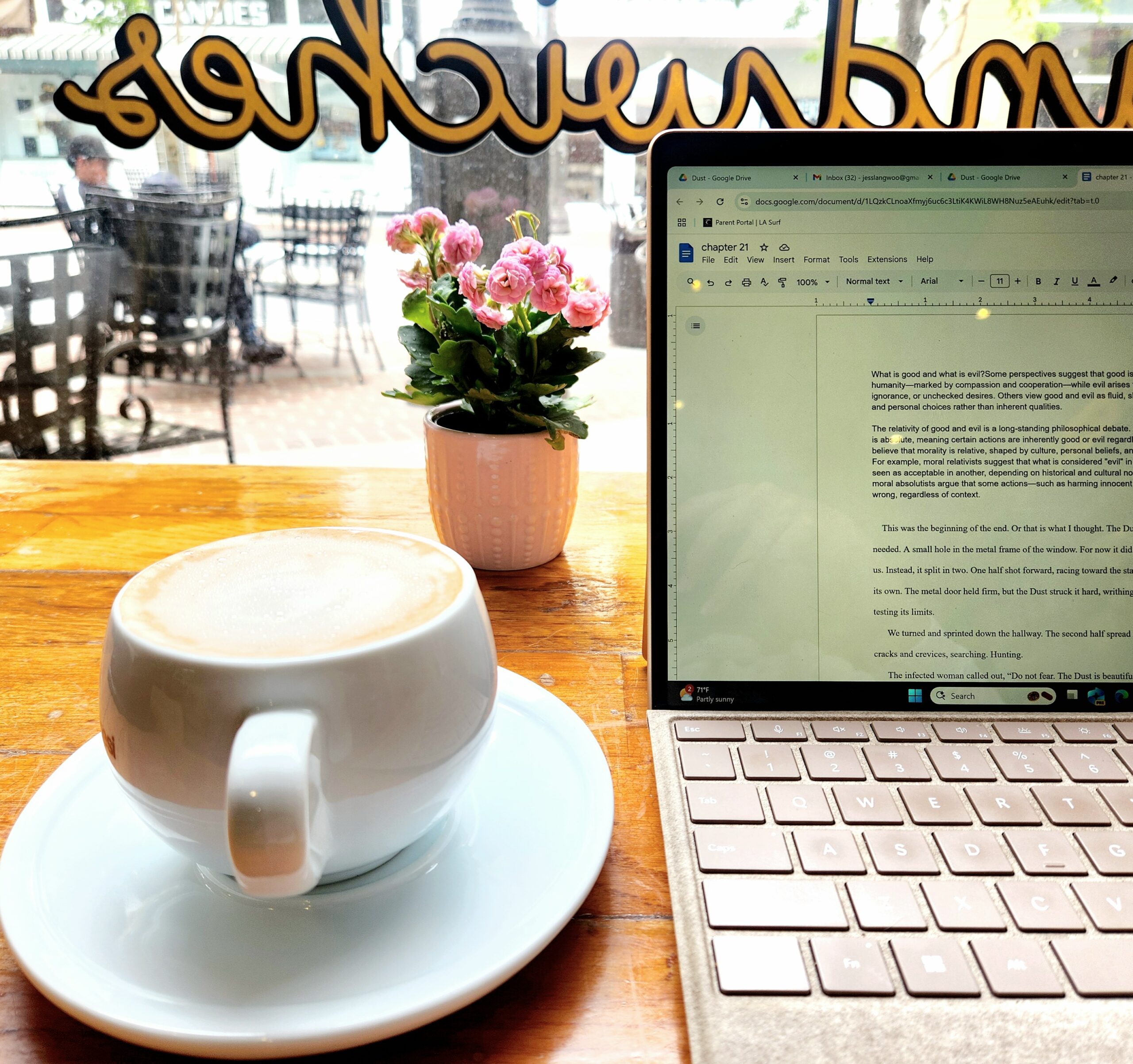 My studio it’s wherever I can carve out for moment of quiet. Sometimes it’s the kitchen table. Other times it’ propped up on a bunch of pillows in my bedroom. I’ve drafted chapters in coffee shops. But most importantly I have a cup of coffee nearby.