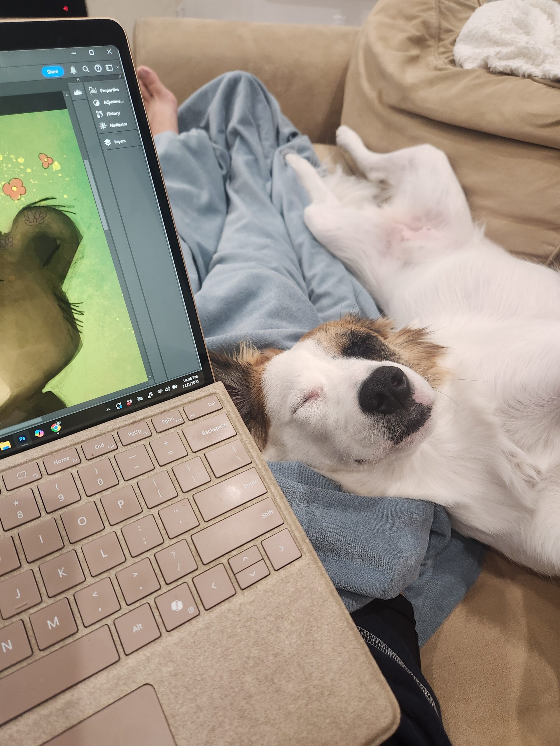 Her studio isn’t a single room. It’s wherever she can find a quiet moment: the kitchen table, a pile of pillows in her bedroom, or a spot in a coffee shop where she can settle with her laptop. No matter where she ends up, there’s usually the smell of coffee nearby, because that’s the one thing she always carries into her workspace. For this visit, it’s just Jessica and the calm space she creates for herself, shaped by soft light and the absence of chatter.