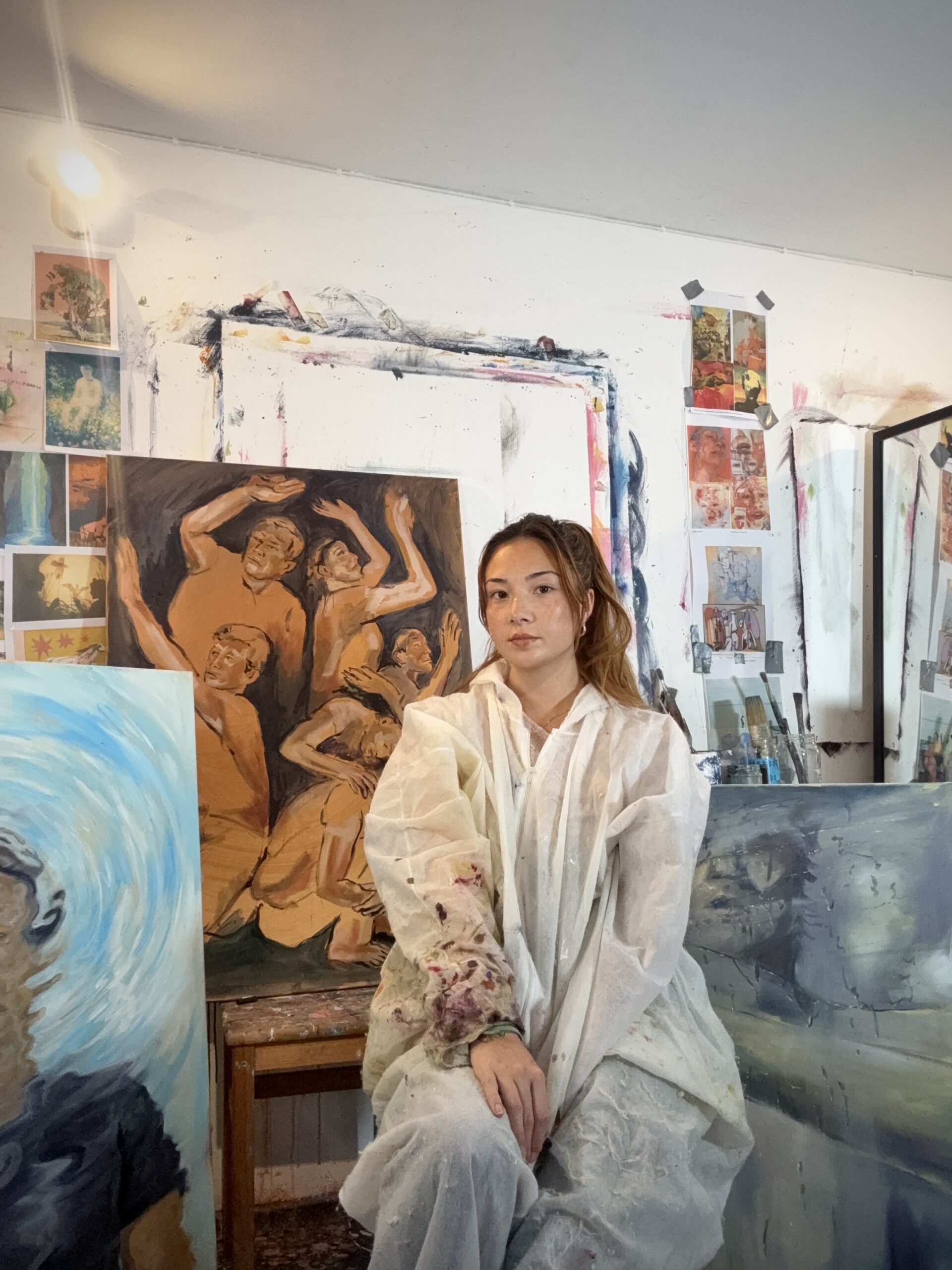 She also speaks about growing up in England with mixed heritage and how that shaped her understanding of belonging. Small acts of trying to fit in, and the stereotypes she encountered, linger in her memory and continue to surface in her paintings. These experiences have made her curious about identity and connection, and how people try to find place and meaning in environments that are constantly changing.