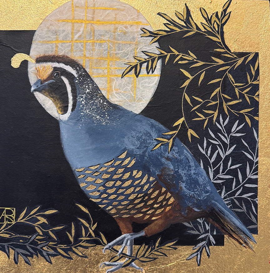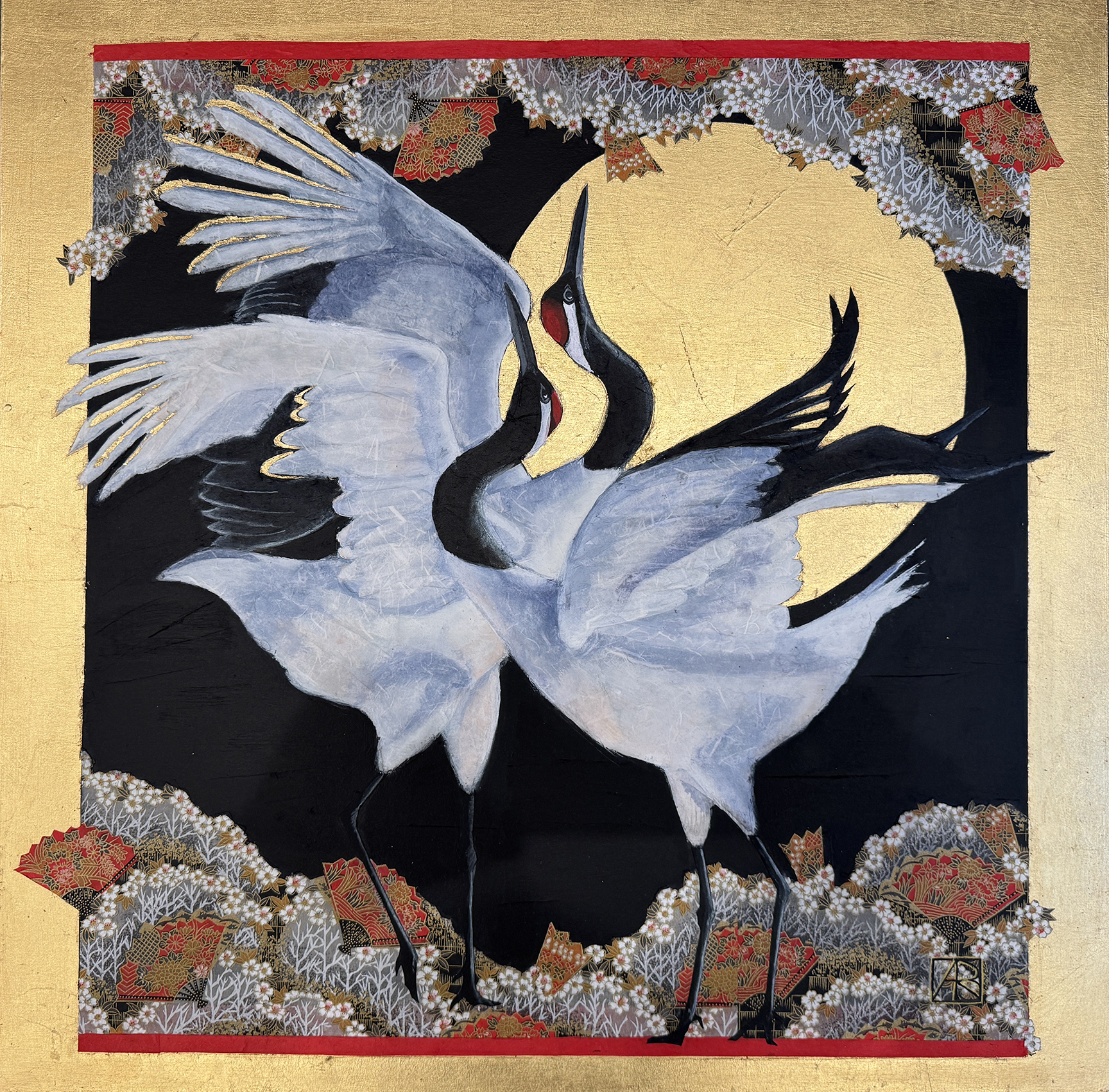 My latest collection, “Simplicity and Elegance in Nature” will be on exhibit at Viewpoints Gallery in Los Altos, California this July. My love of Japanese art and the Art Deco movement inspires this collection. This is my first collection to feature gold leaf and collage, and I am excited to combine my love of wildlife with my passion for handmade paper. It is also a personal tribute to my late mom, who spent a year abroad in Kyoto, Japan, in college. Her lifelong love of Japanese culture and style strongly influenced my aesthetic; she taught me the value of simplicity in design, and her love of art inspired me to pursue a career as an artist.