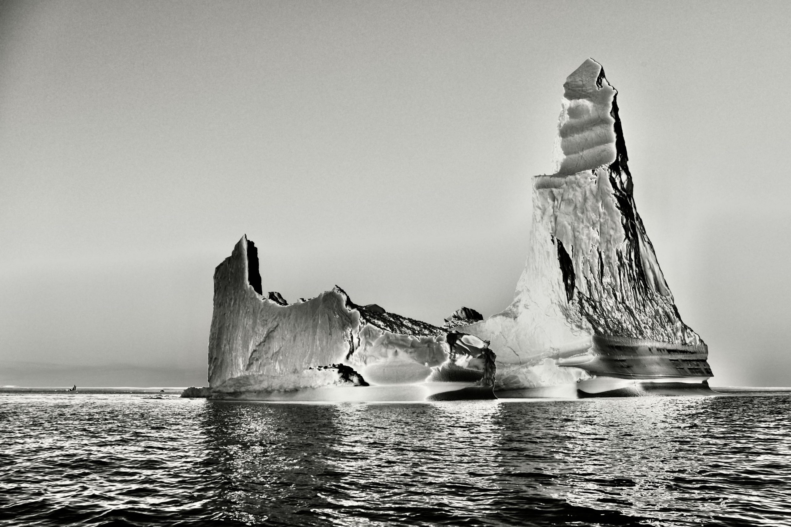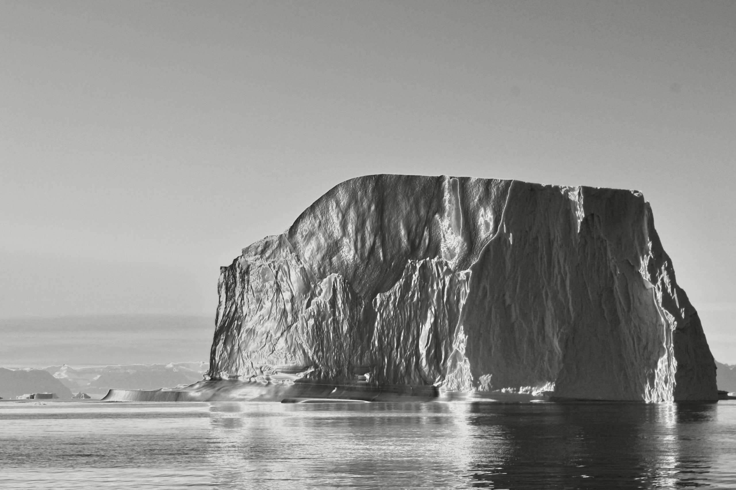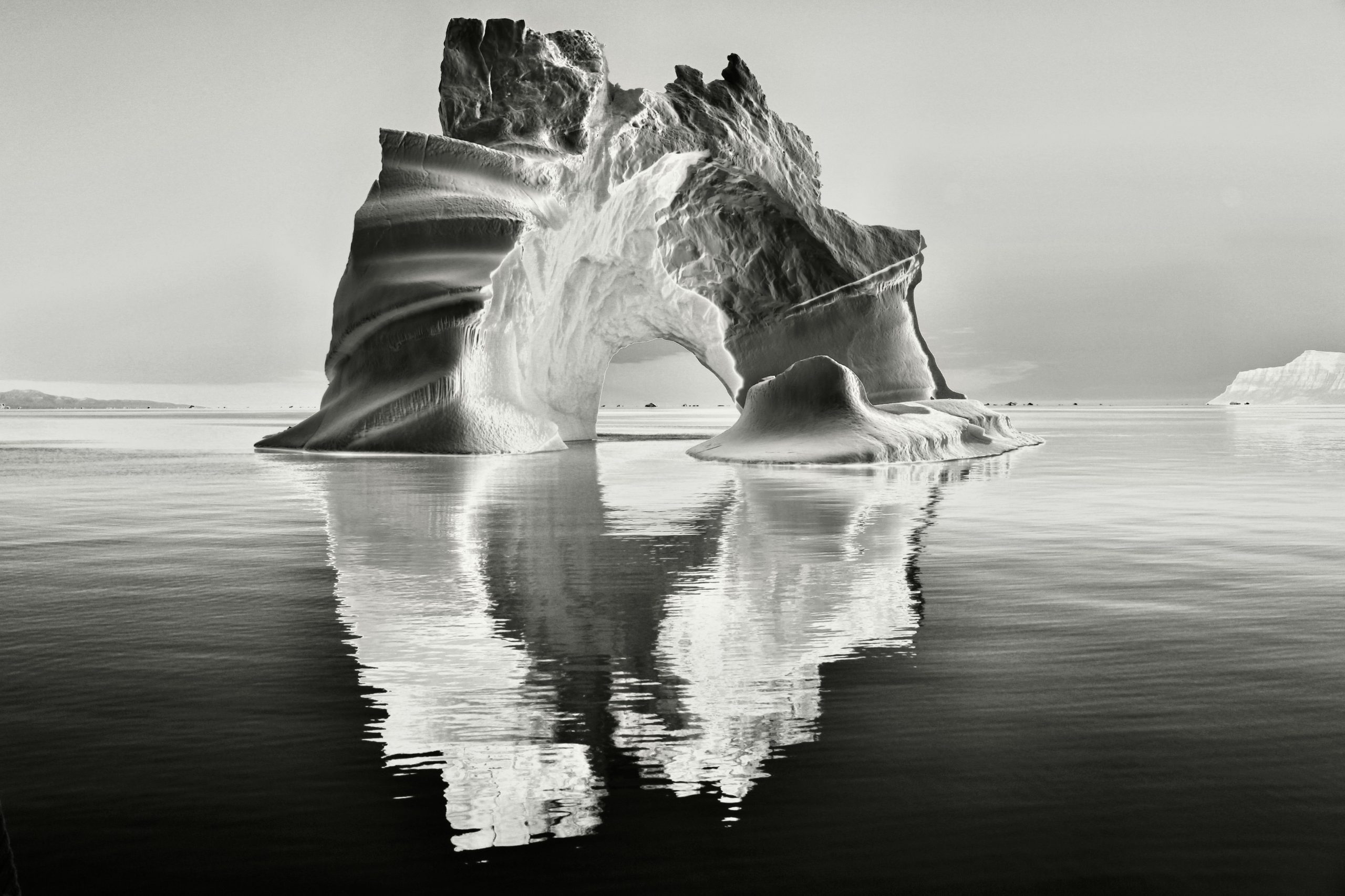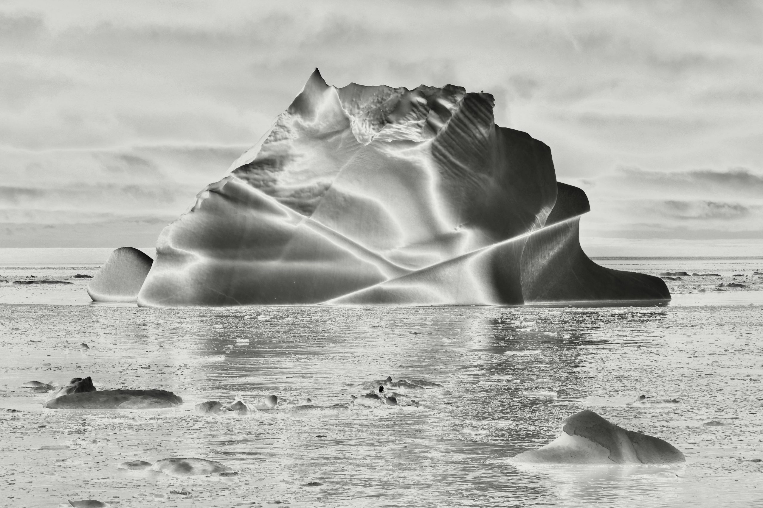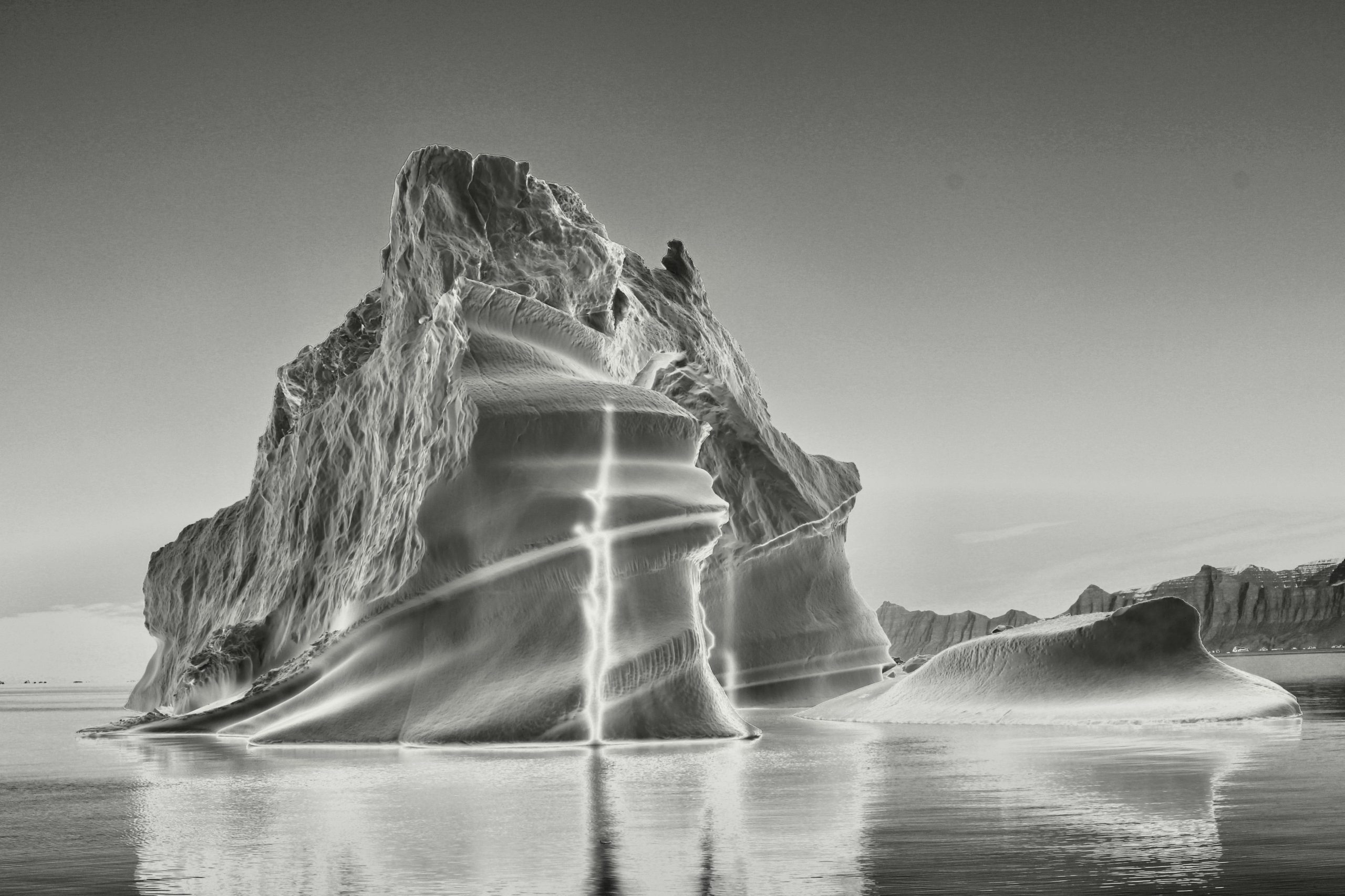 For the exhibition ‘Of Mutability’ (2024), she selected some of the digital colour photographs of Arctic icebergs from her 2016 voyage to Greenland. The images were then converted to black and white and printed onto poster paper with low-grade inks, guaranteed to fade and disappear over time. Lydiat used these experimental photographic images as objects and, like the actual icebergs, subjected them to the vagaries of our climate. In her latest artwork, ‘Immutability’ (2025), the faded, deconstructed images have been ‘freeze framed’ and printed with high-quality inks and paper, ensuring that the moments of irreversible change are permanently suspended.