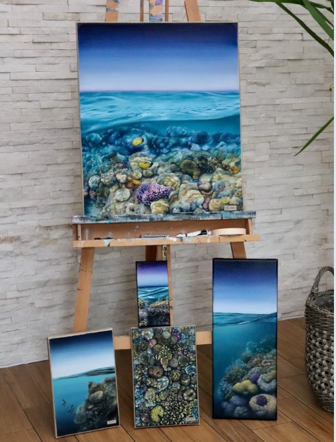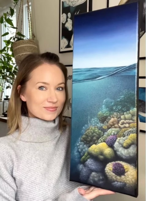 Her childhood was spent in Southeast Asia, surrounded by warm seas, coral reefs, and tropical light. Those memories are still alive in her work. Many of her pieces focus on marine life sea turtles, fish, whales often painted with a tenderness that comes from both admiration and worry. Her art carries the sense of someone who has seen beauty firsthand and knows how fragile it can be.