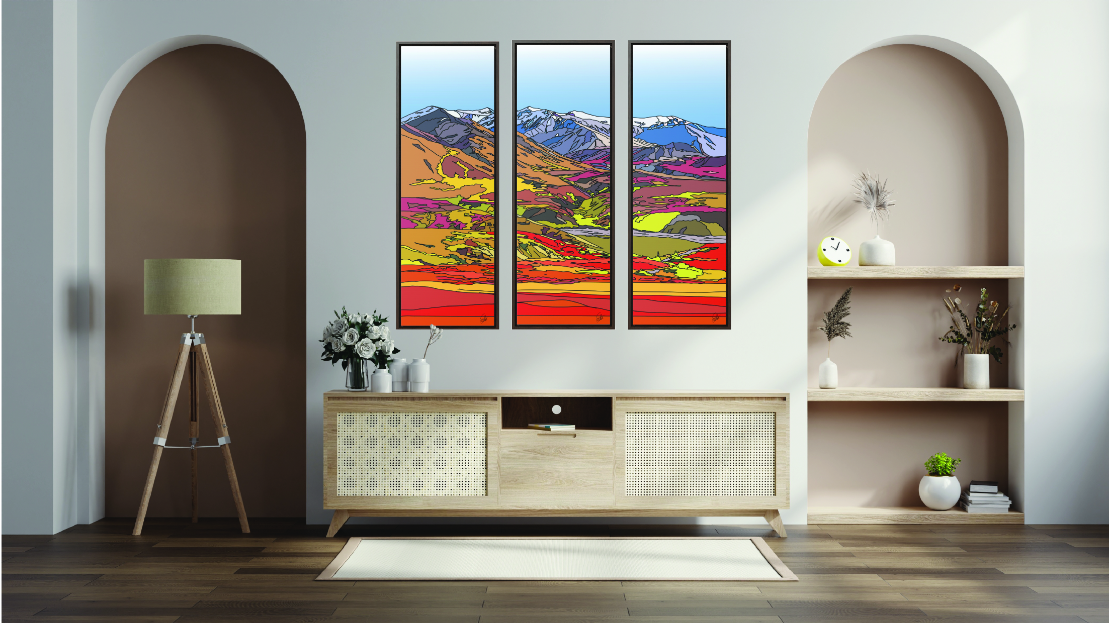 She spent years working in the graphic design industry, painting signs for commercial use. Those experiences equipped her to create artistic imagery containing positive visual messaging. The strong lines and vibrant colors inherent in her graphically inspired artworks are peaceful and joyful, brilliant glimpses of possibilities over the horizon. The artist currently resides in Alaska, and her most recent works depict the vast Northern landscape she now calls home. Her signature bold lines, high chroma colors, and soothing geometric structure continue to be defining features of her work, acting as anchor points to ensure she remains true to her artistic vision. Esther creates with purpose as she navigates new territory, staying on course as her work develops. “I have always known how to keep my eye on the North Star,” Esther remarks. “If you know how to find it, you know where you are and how to get back home. You will never be lost.”
