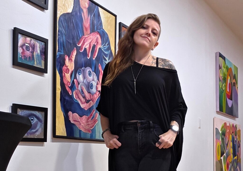 She paints figures and faces and eyes. And the eyes in particular do something you don’t forget. They hold you. Not poetically. Actually. You look at them and they look back and for a second you’re not sure who’s doing the seeing anymore.