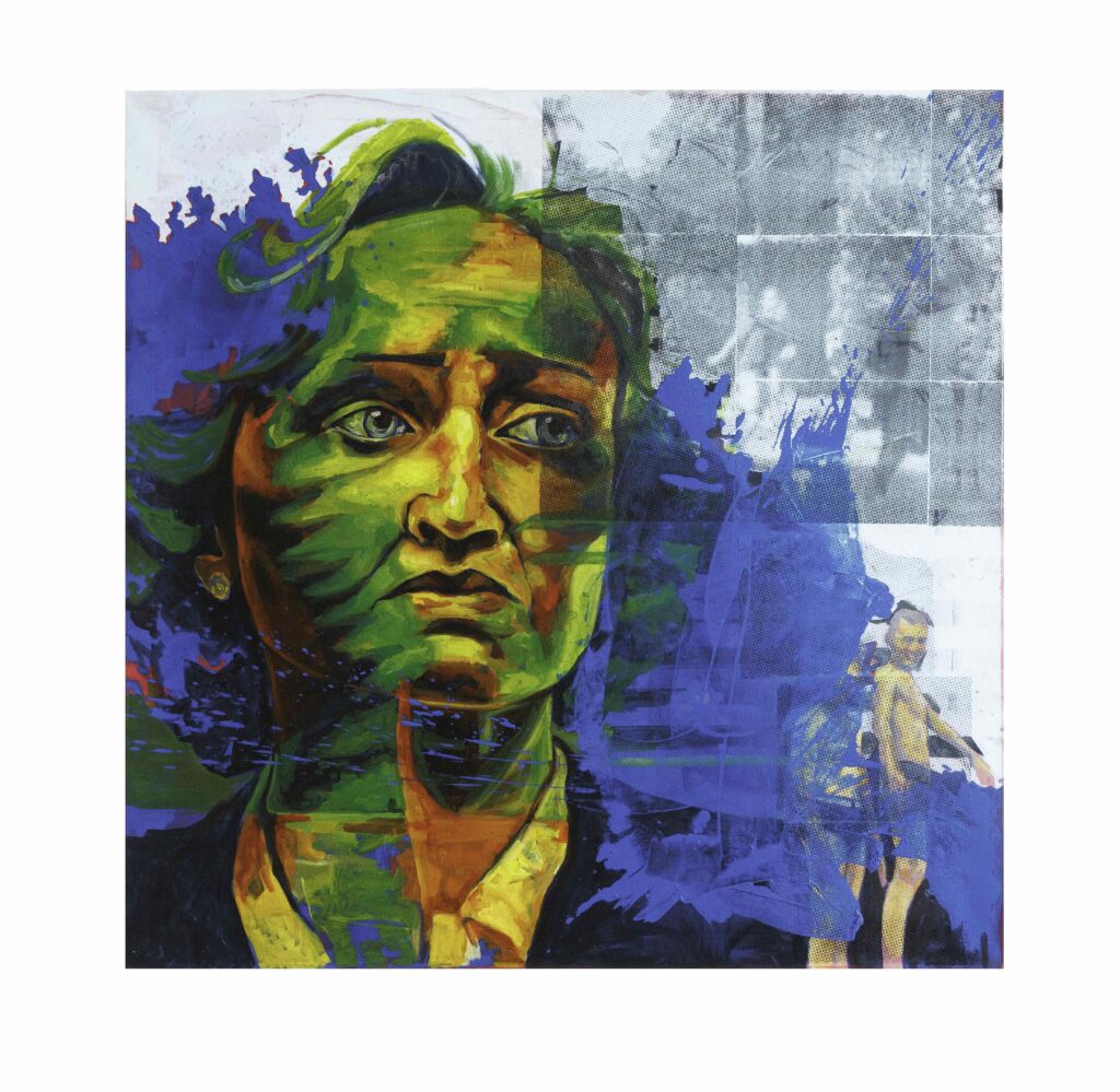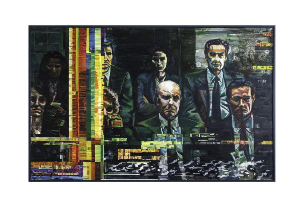 Heidi is a selected artist for the Faces exhibition and what she does sounds simple until you stand in front of the work. She paints from frozen stills of Law & Order episodes. Takes a paused frame and crops it, distorts it, withholds information until what’s left on the canvas is a fragment so charged with tension you feel like you just walked into a conversation you weren’t supposed to hear.
