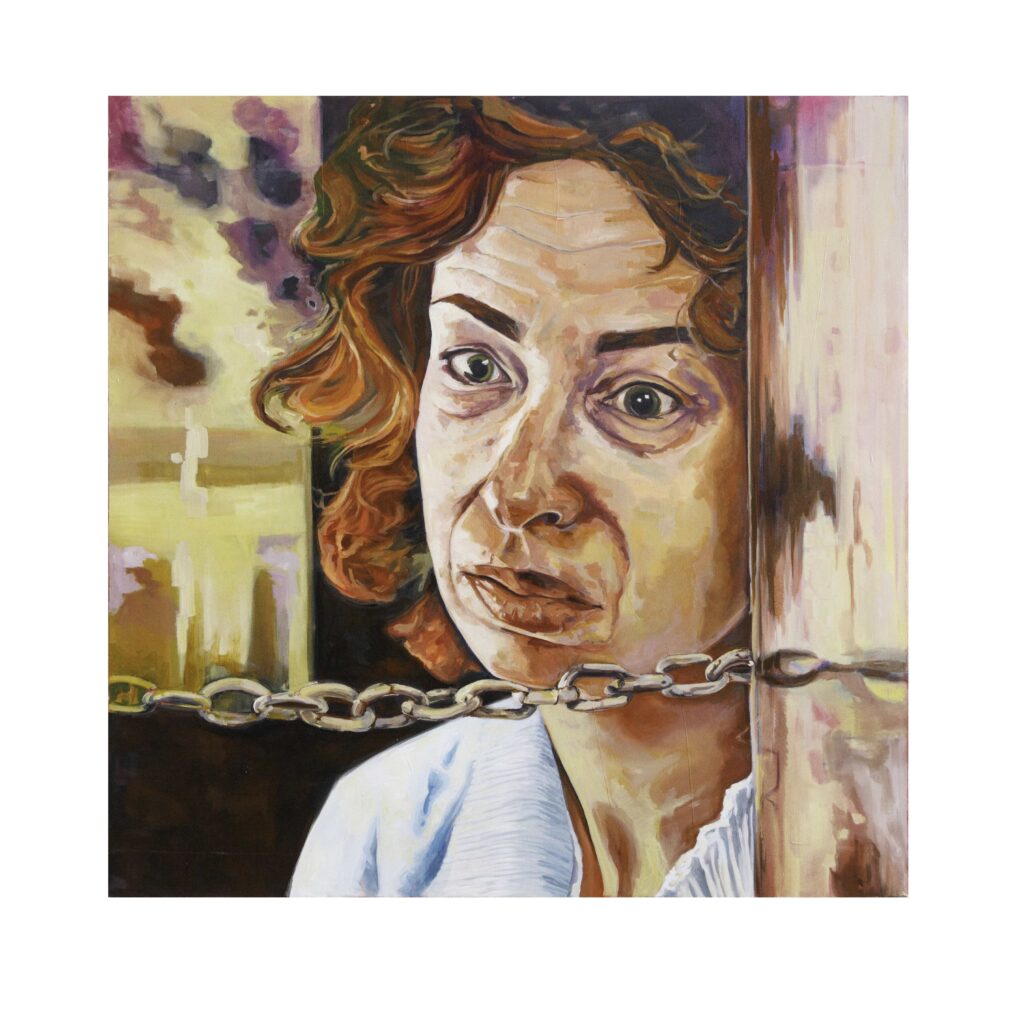 Most of us never think about that material. We file it under background noise and move on. Heidi doesn’t move on. She pauses there. Literally. She takes the frozen frame and she sits with it and she paints what it left behind in her, not the plot or the drama or the narrative but the feeling. The strange quiet between scenes. The hand on a doorknob. The hallway that feels wrong even though nothing visible is happening. The emotional residue of growing up in front of a screen that was always telling stories your body was absorbing even when your mind wasn’t paying attention.