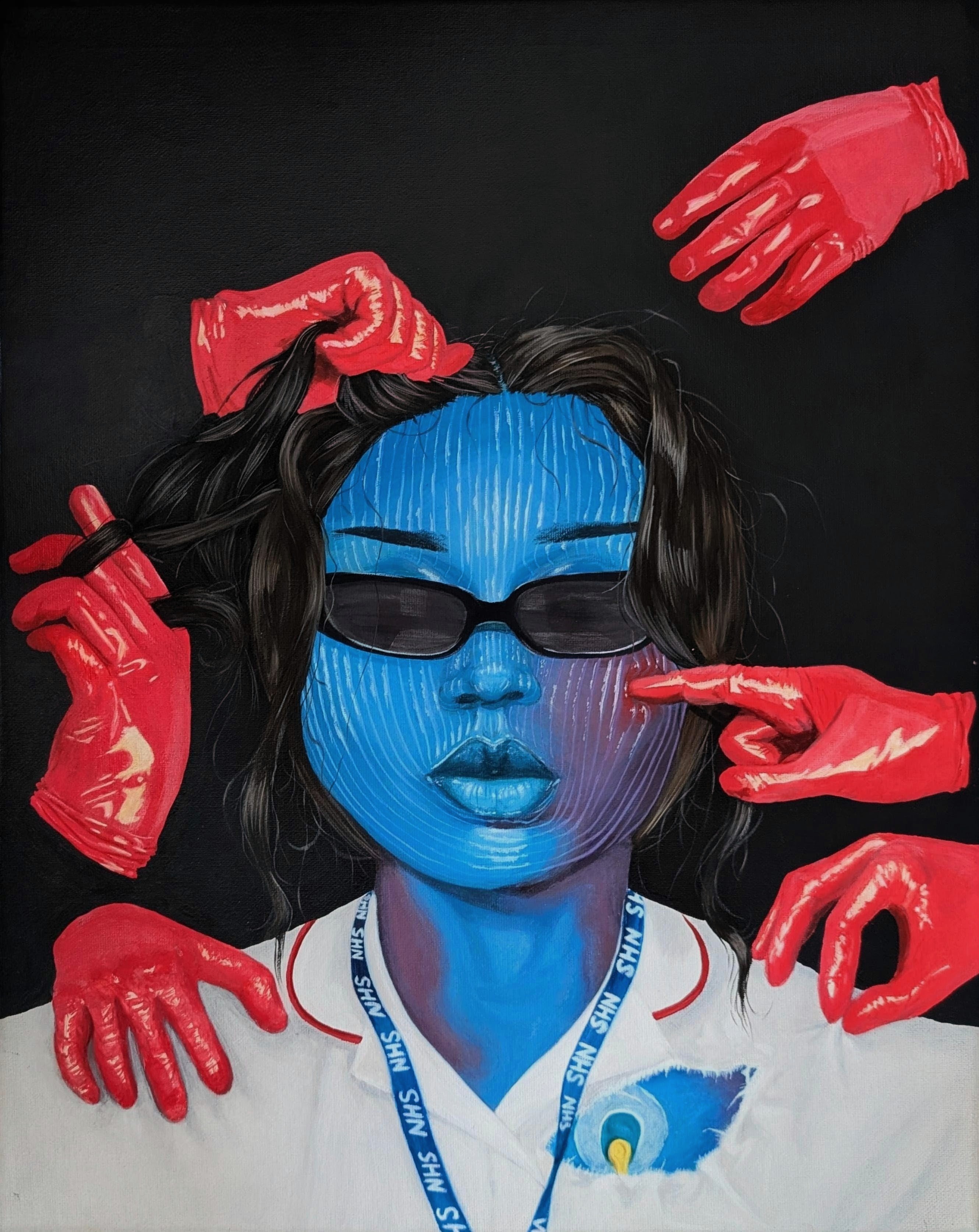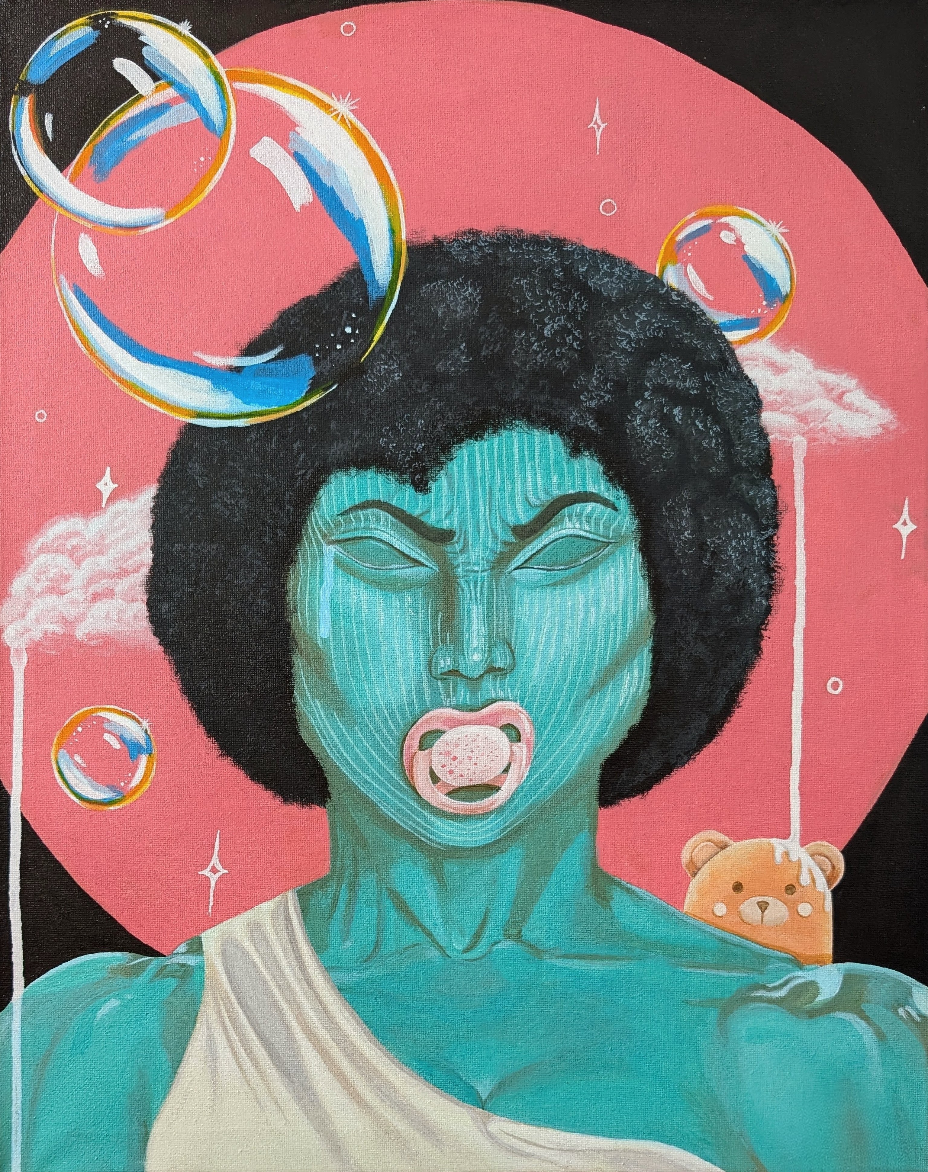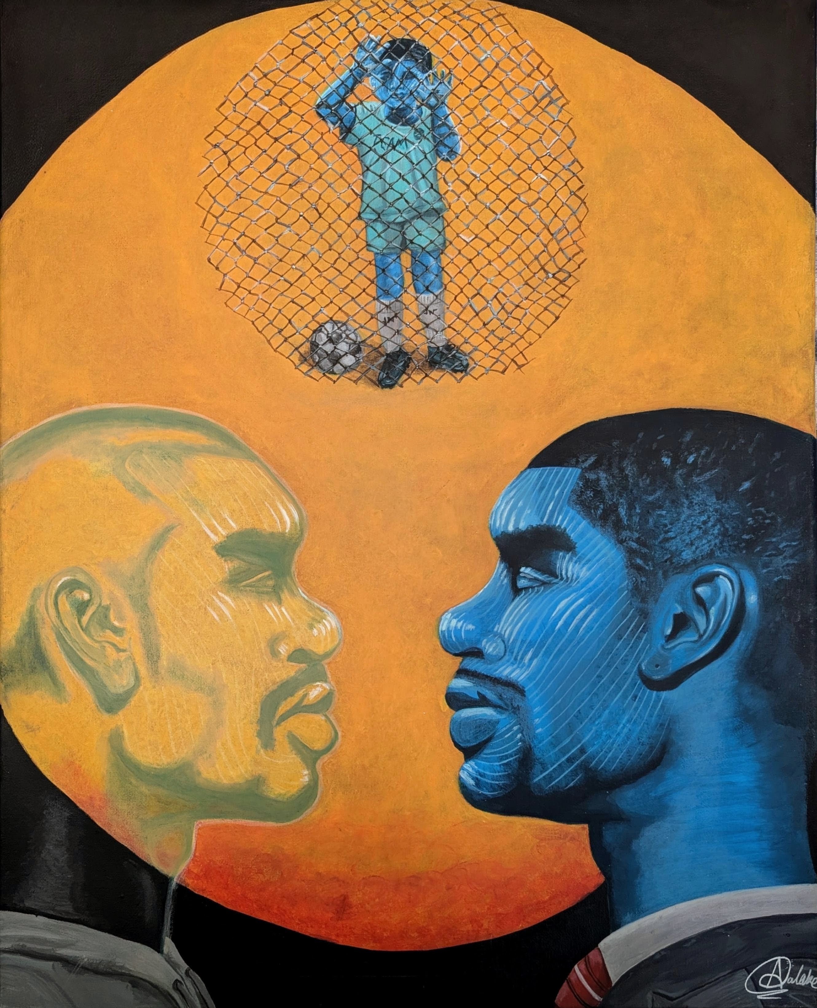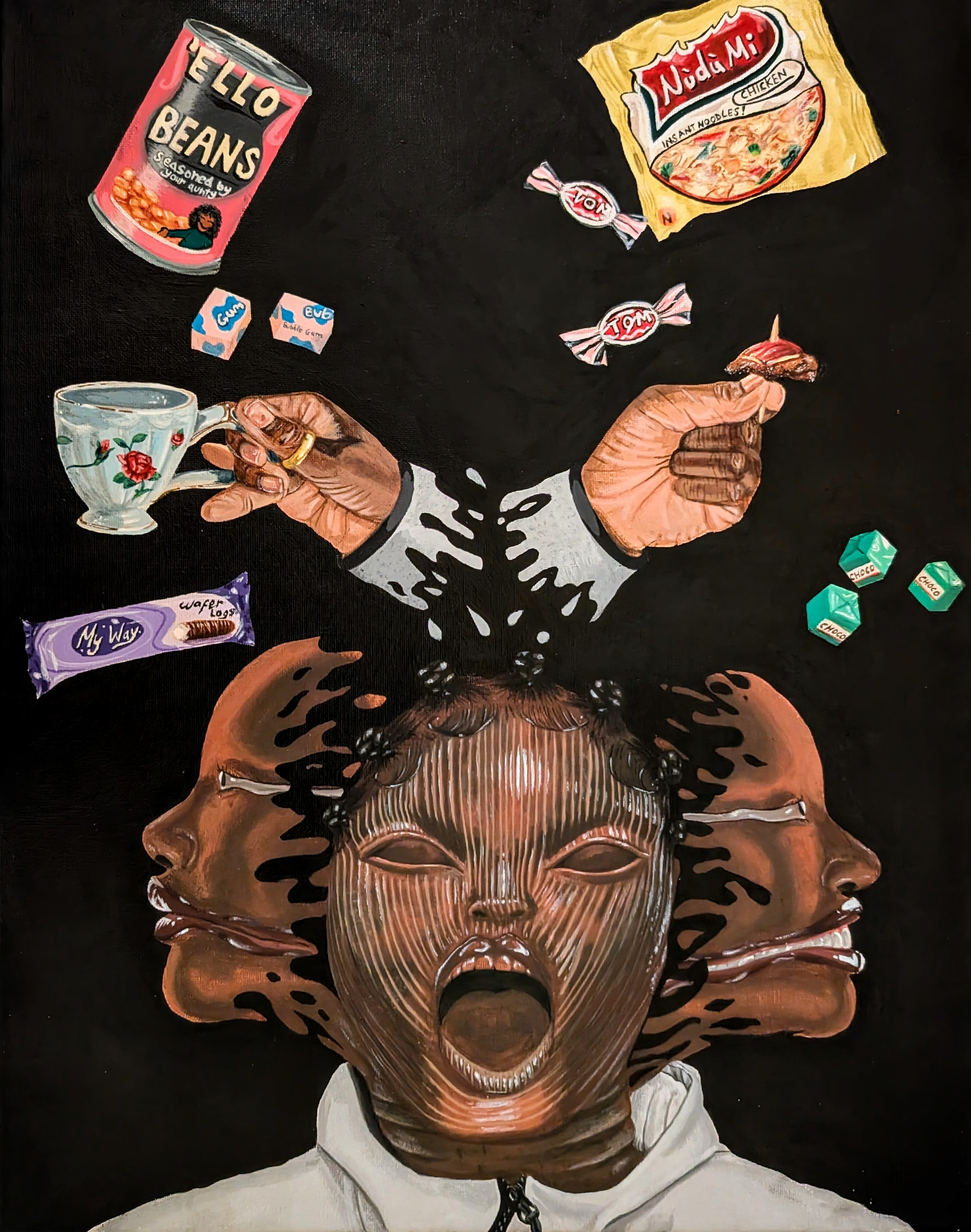 I work primarily in acrylic, drawing from life experiences and my Nigerian heritage. I often blend ancient cultural symbols, such as the lle Ife bronzes, with surrealist elements and modern themes. My process involves concept mapping, emotional colour choices, and reflective writing alongside each piece.