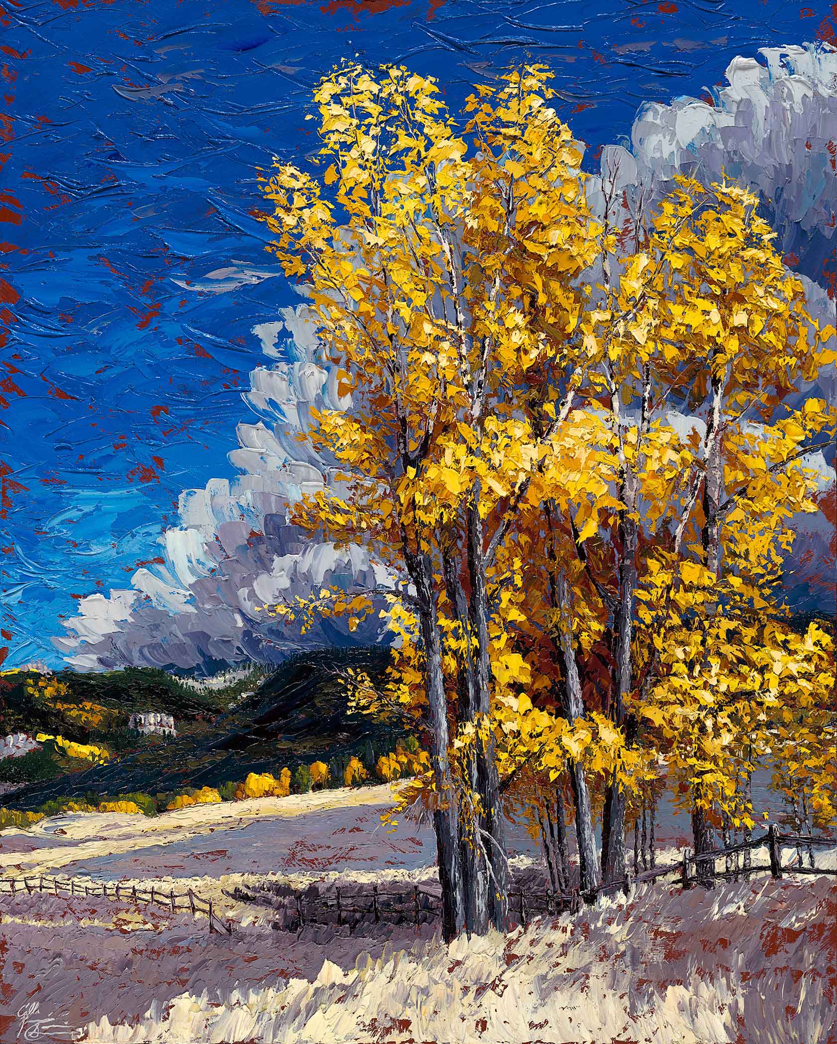 Drawing from vivid memories gathered hiking, camping, and wandering across New Mexico’s wilds and the greater West, I paint from both observation and imagination—evoking the hush of snow, the shimmer of autumn leaves, and the dramatic dance of shadow, sun, and storm. My palette knife builds layers of texture and color, crafting landscapes that offer a meditation on time, place, and reverence for the natural world.