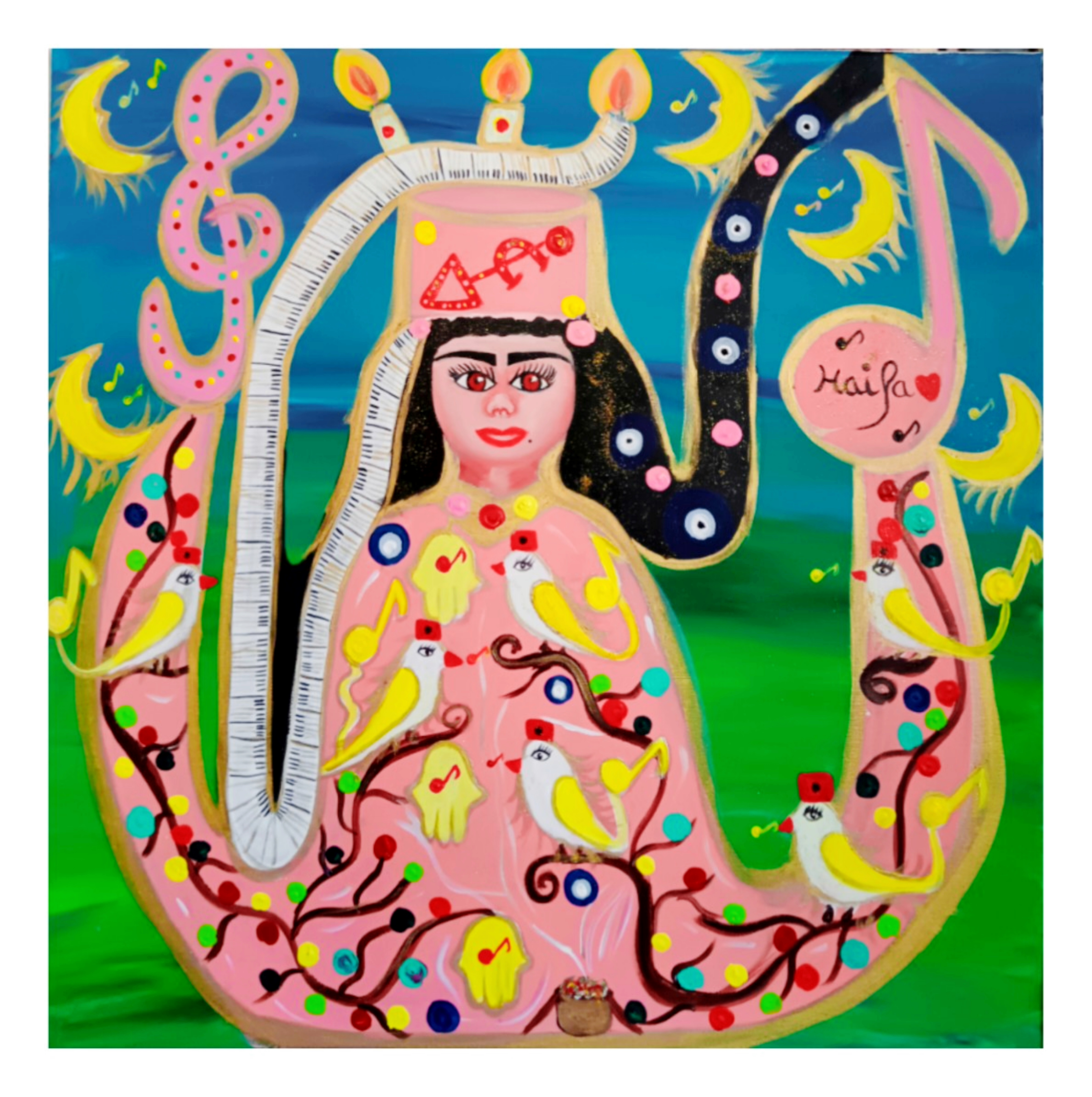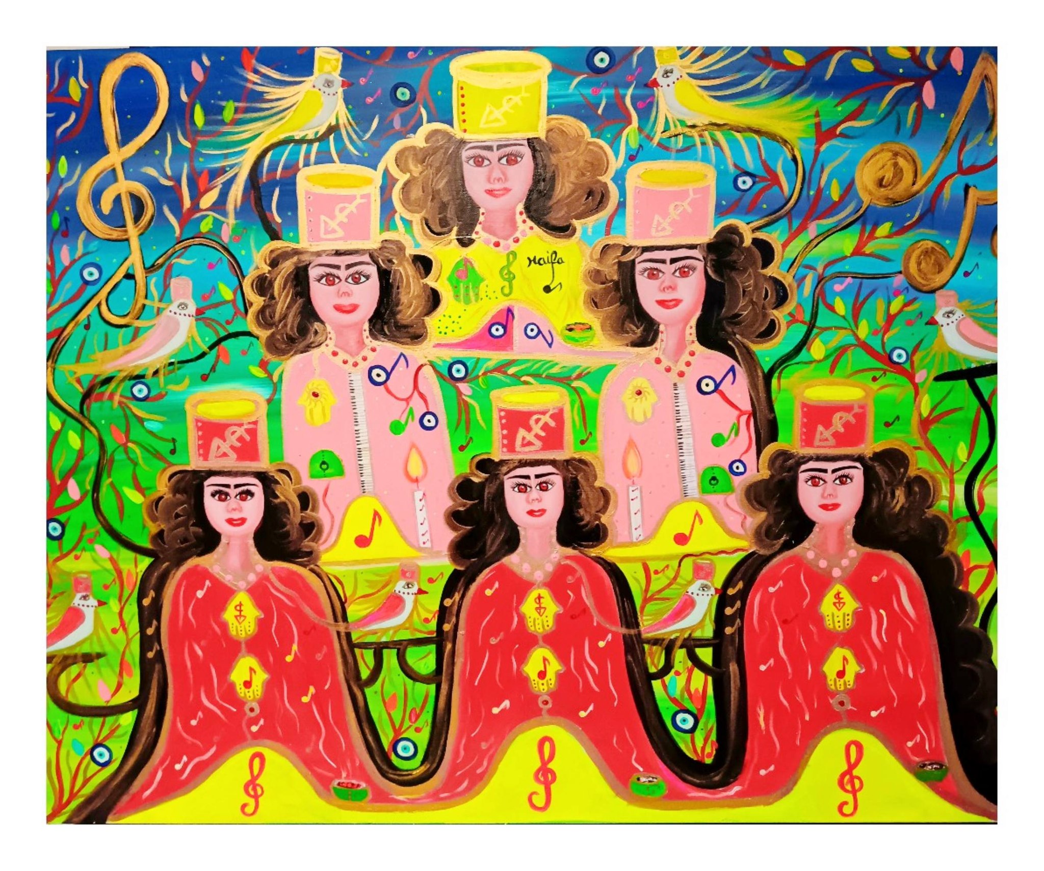 Le style d’Haïfa est immédiatement reconnaissable : des femmes lumières, des lunes protectrices, des clés de sol comme des battements d’âme, des oiseaux messagers, des couleurs brûlantes, rouges, orangées, dorées…