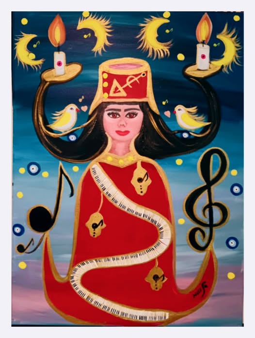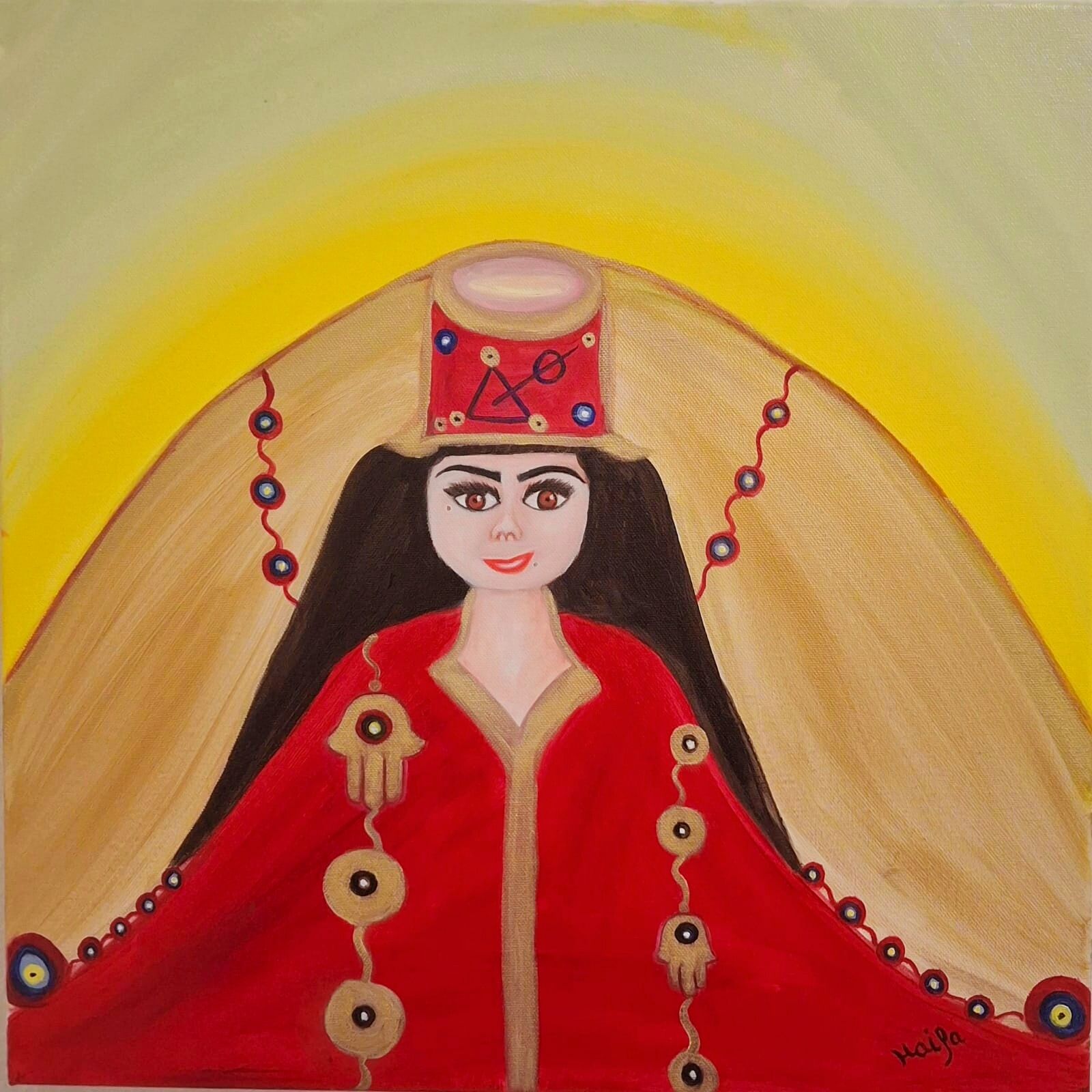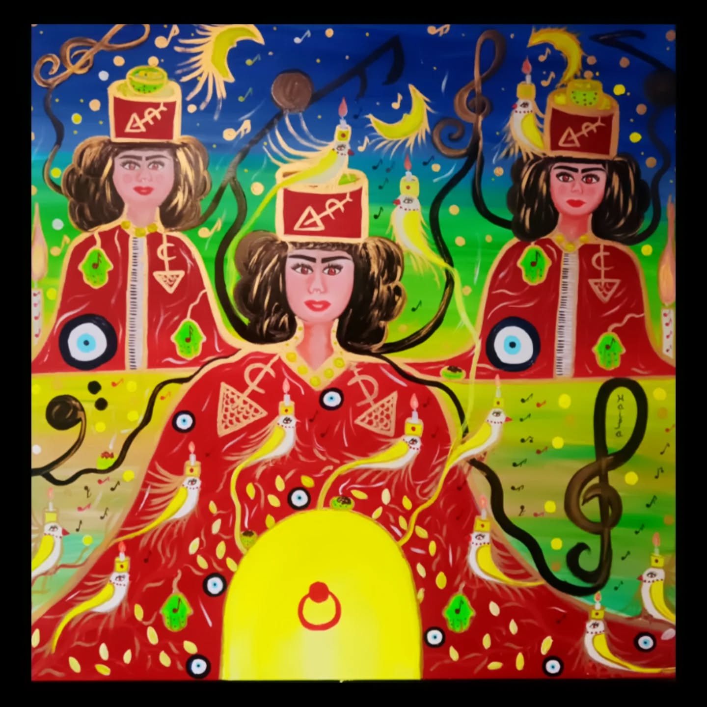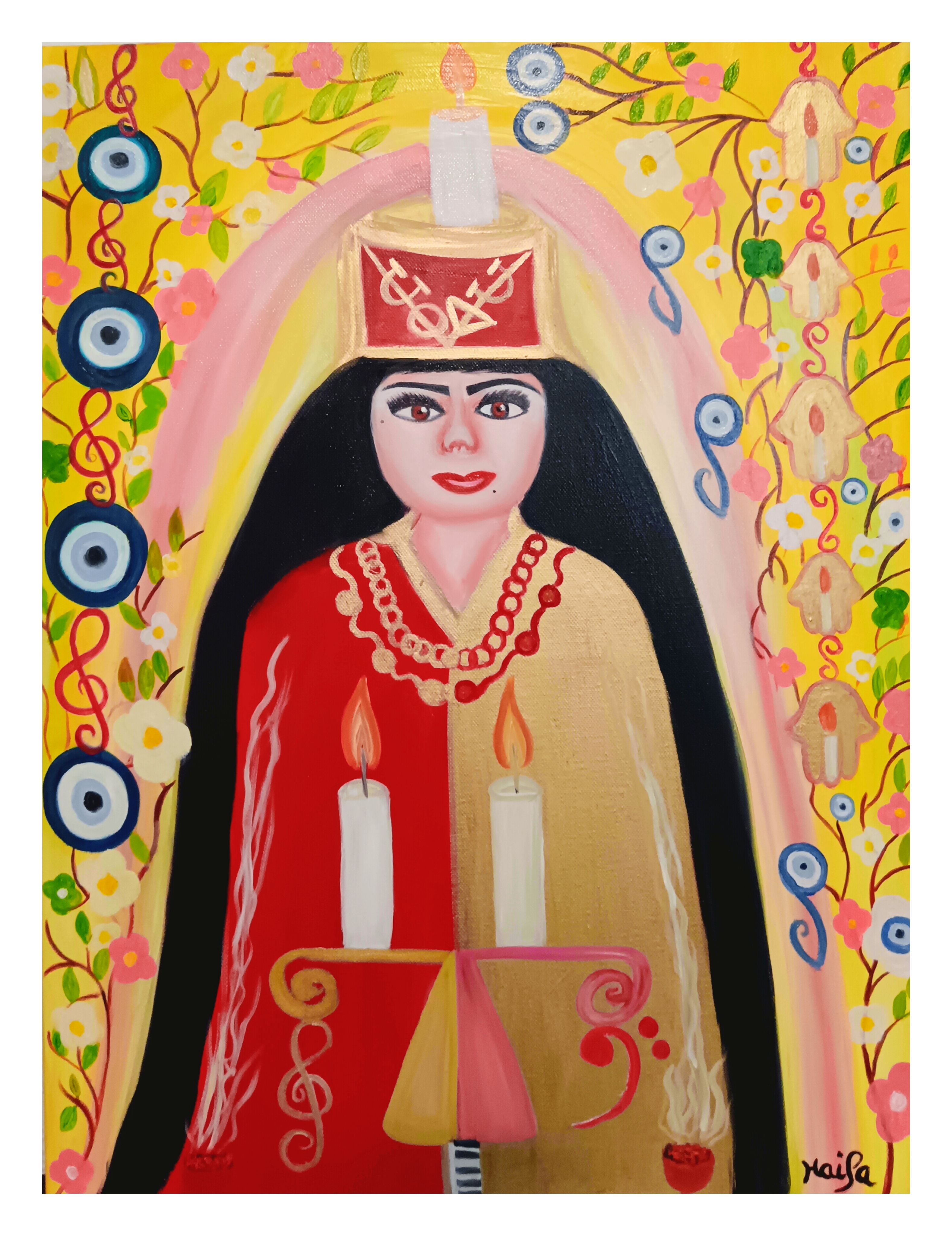 Mon art s’inspire profondément du féminin sacré, de la lumière intérieure et des héritages mystiques qui traversent les femmes de la Méditerranée. Je puise mes thèmes dans la spiritualité soufie, les rituels ancestraux, les symboles protecteurs et les couleurs sacrées qui évoquent la guérison, la force et la renaissance.