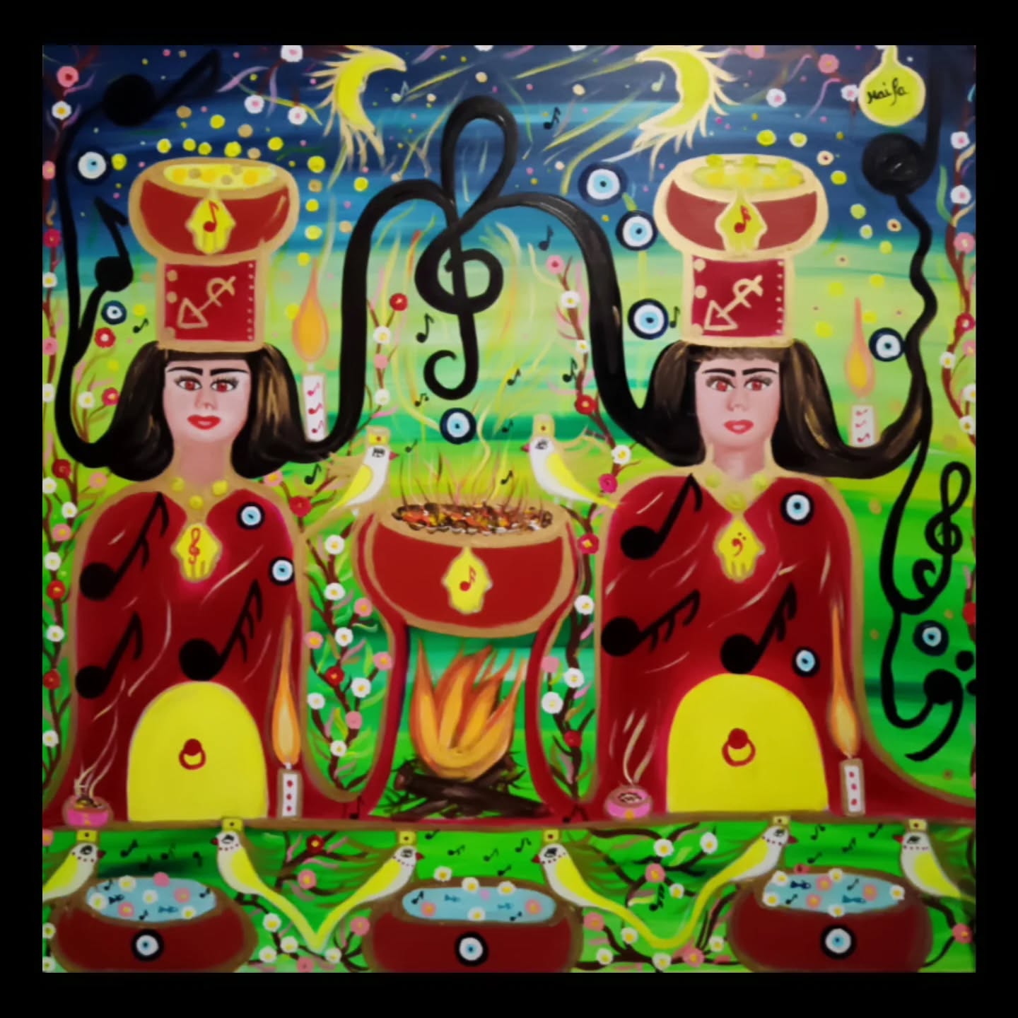 Je peins des visages qui ne sont pas des portraits, mais des présences. Ils portent des clés de sol, des lunes, des oiseaux, des mains protectrices : autant de talismans qui racontent la résilience, la beauté intérieure et les héritages méditerranéens qui m’habitent.