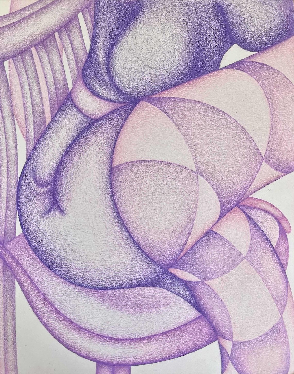 Her drawings hope to provoke similar conversations and provide different perspectives on how bodies can exist in a confusing space. Monochrome colored pencil works feature intimate snapshots that expand the universe that the work imagines. The scenes in these drawings are more passive, reminiscent of what would be seen when scrolling through a social feed within an absurdist universe.