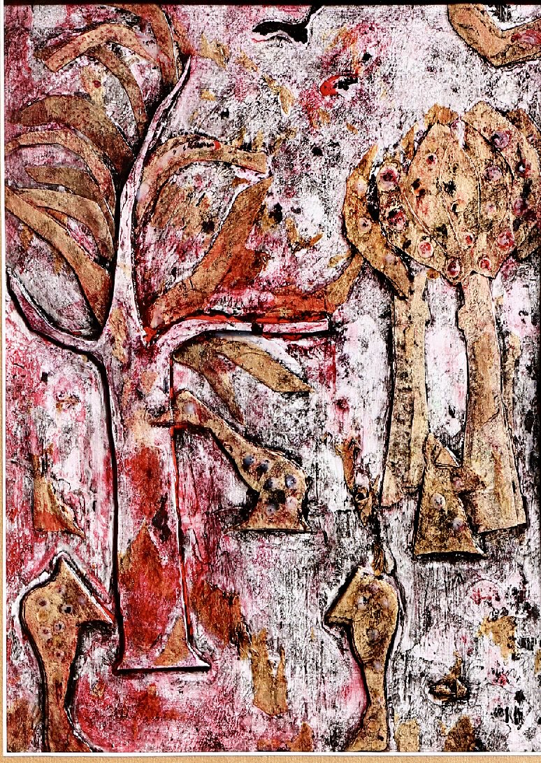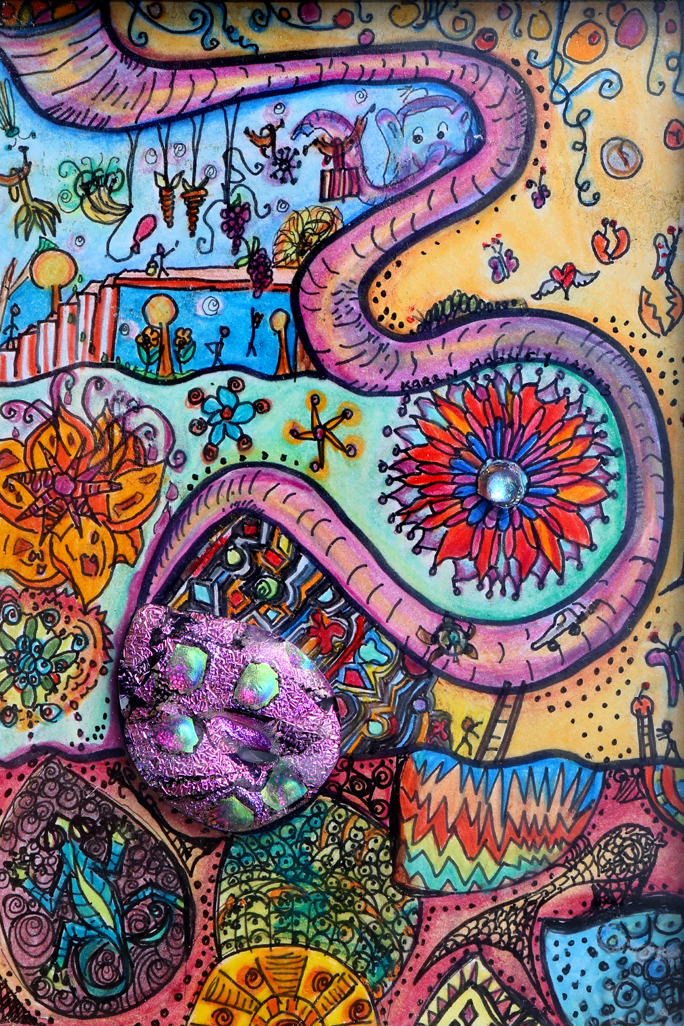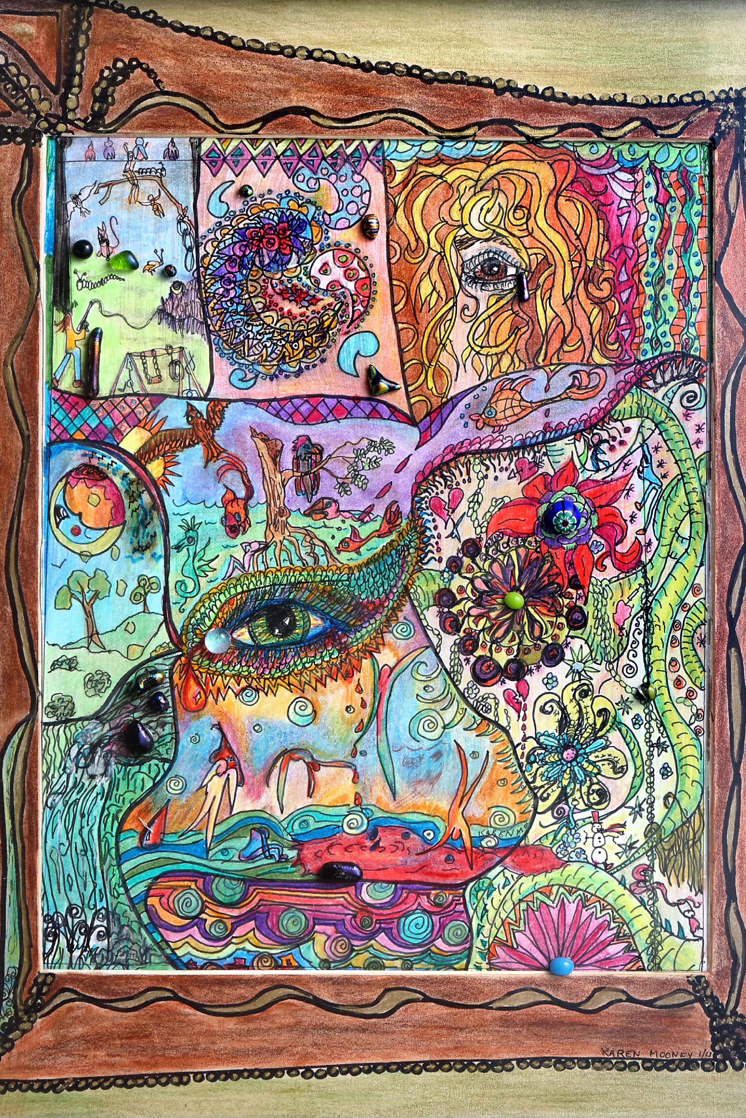 My creative process is both intuitive and deliberate. It begins when I receive inspiration, evolving through layers of color and contrast. I often experiment with color combinations that may not typically go together and use various mediums, including glass, beads, and fiber. I enjoy working with ink, watercolor, and Derwent Inktense pencils to add depth and complexity to my work. Each piece reflects a dialogue between my conscious intentions and subconscious impulses, creating a rich fusion of color and texture.