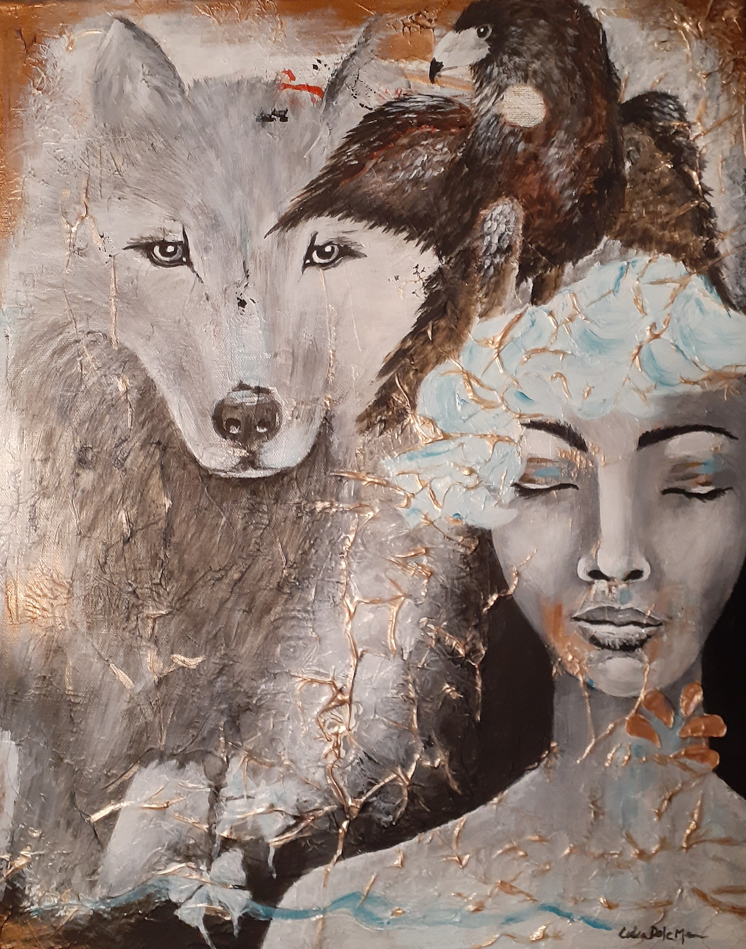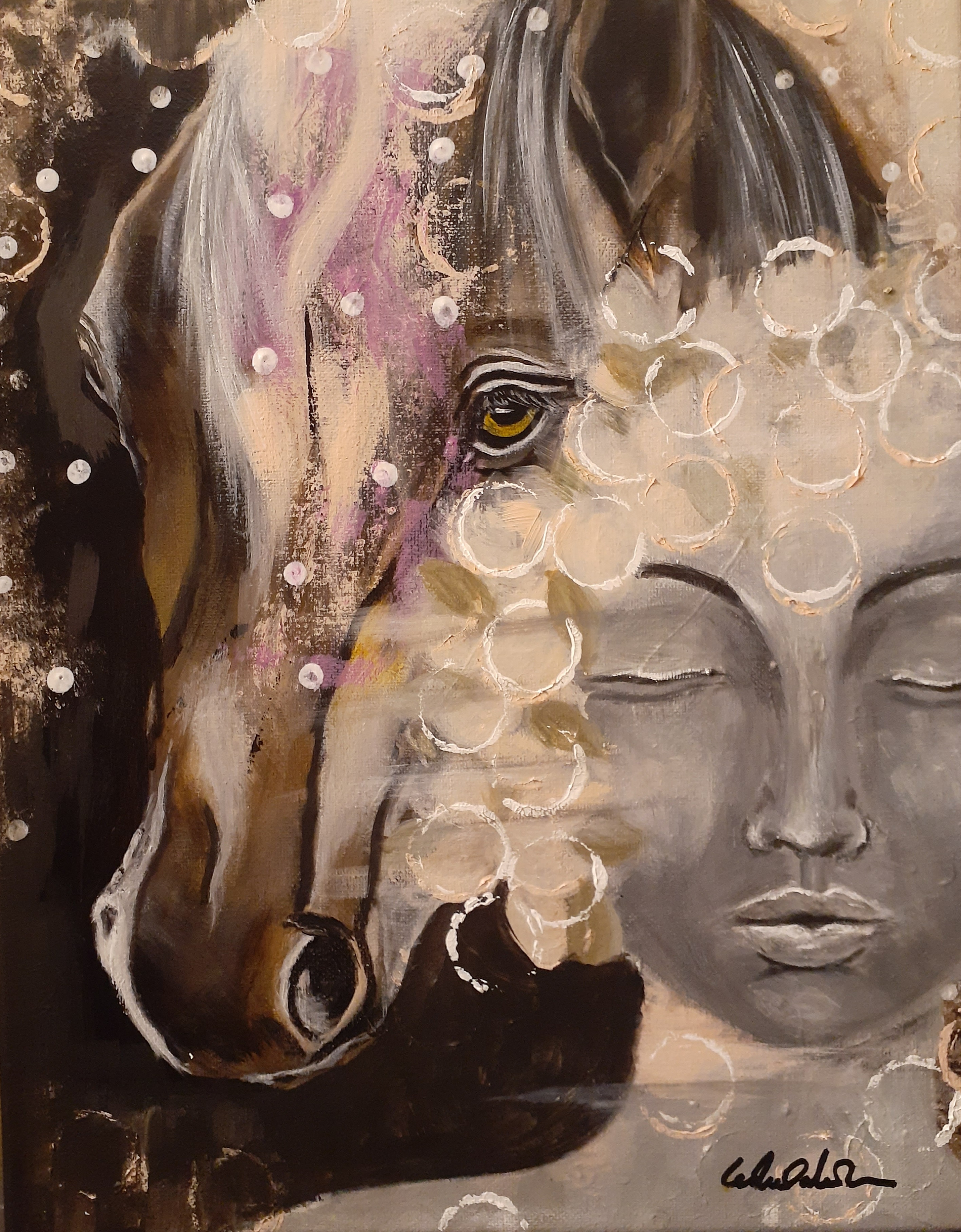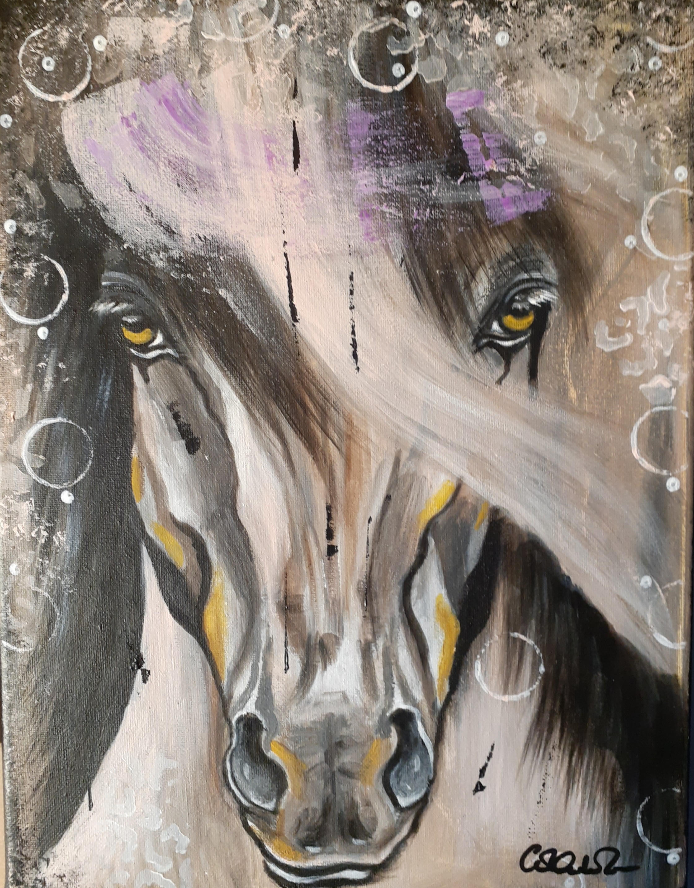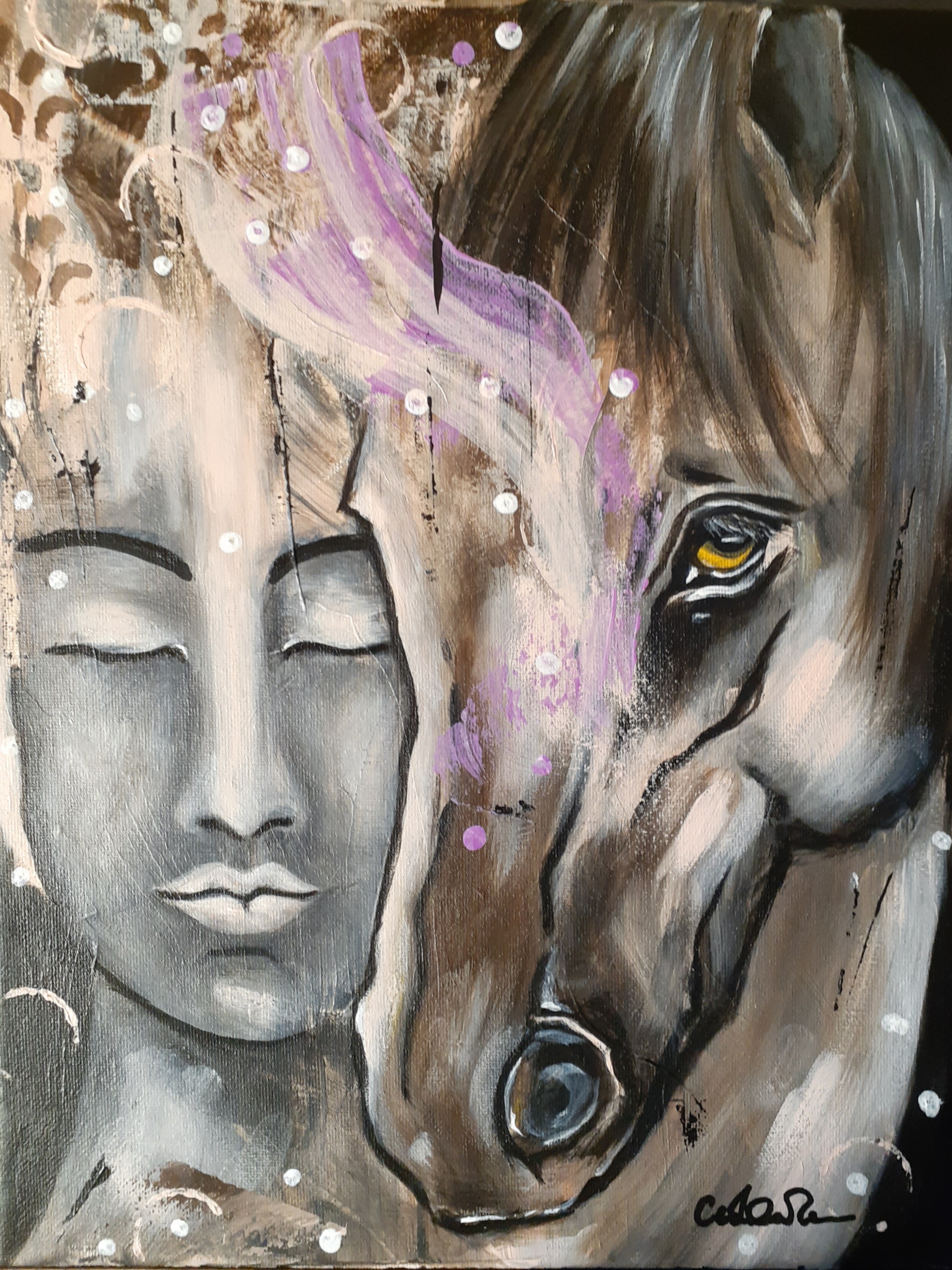With a strong connection to huskies who deliver daily doses of soulful energy, I set about to capture this through texture and color so it could be shared visually with the onlooker. Creating storylines through images and connection with female energy. Imaginative, spontaneous and reflective work. Reflecting a world with animals and strong female energy to support intuition and a feel good vibe. Texture helps me to create an atmosphere and an emotion, connecting the painting with the seeker!