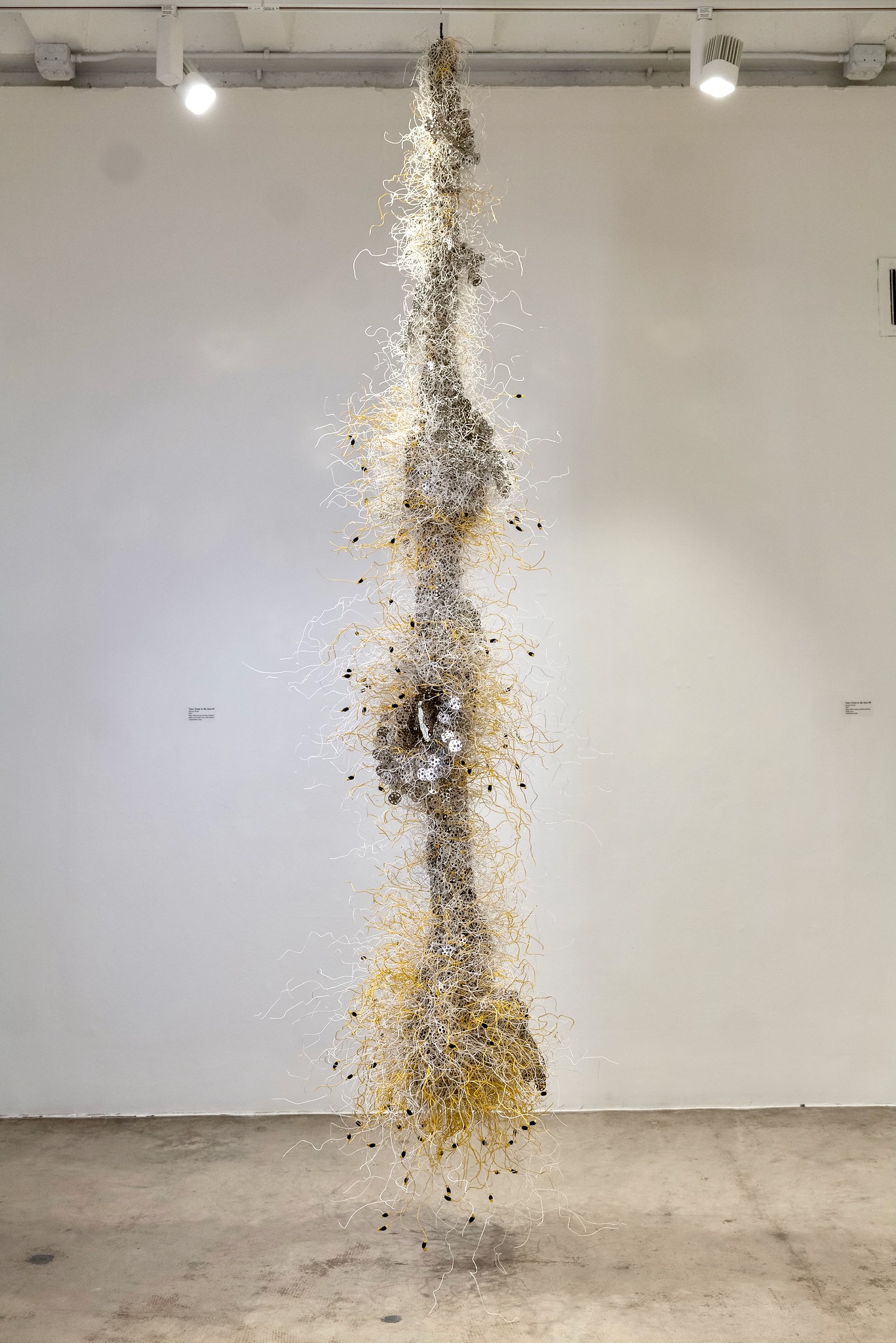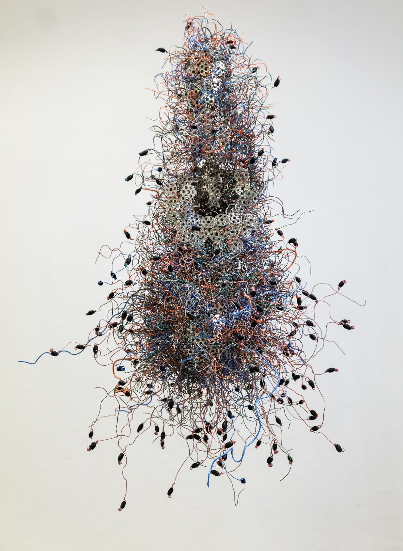 I construct biomorphic assemblages from the overlooked materials of everyday life—zip ties,hairnets, electrical components, wire—fusing them into forms that challenge the boundaries between the organic and the manufactured.