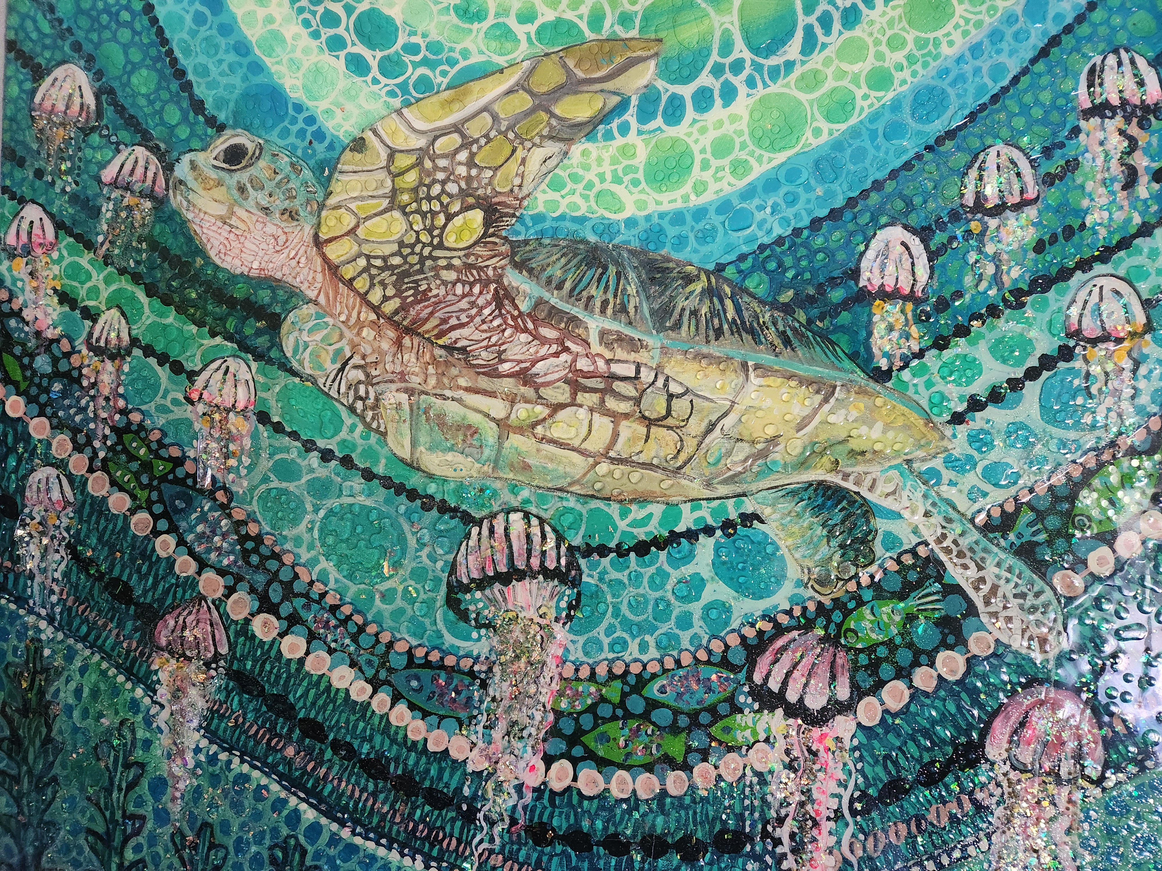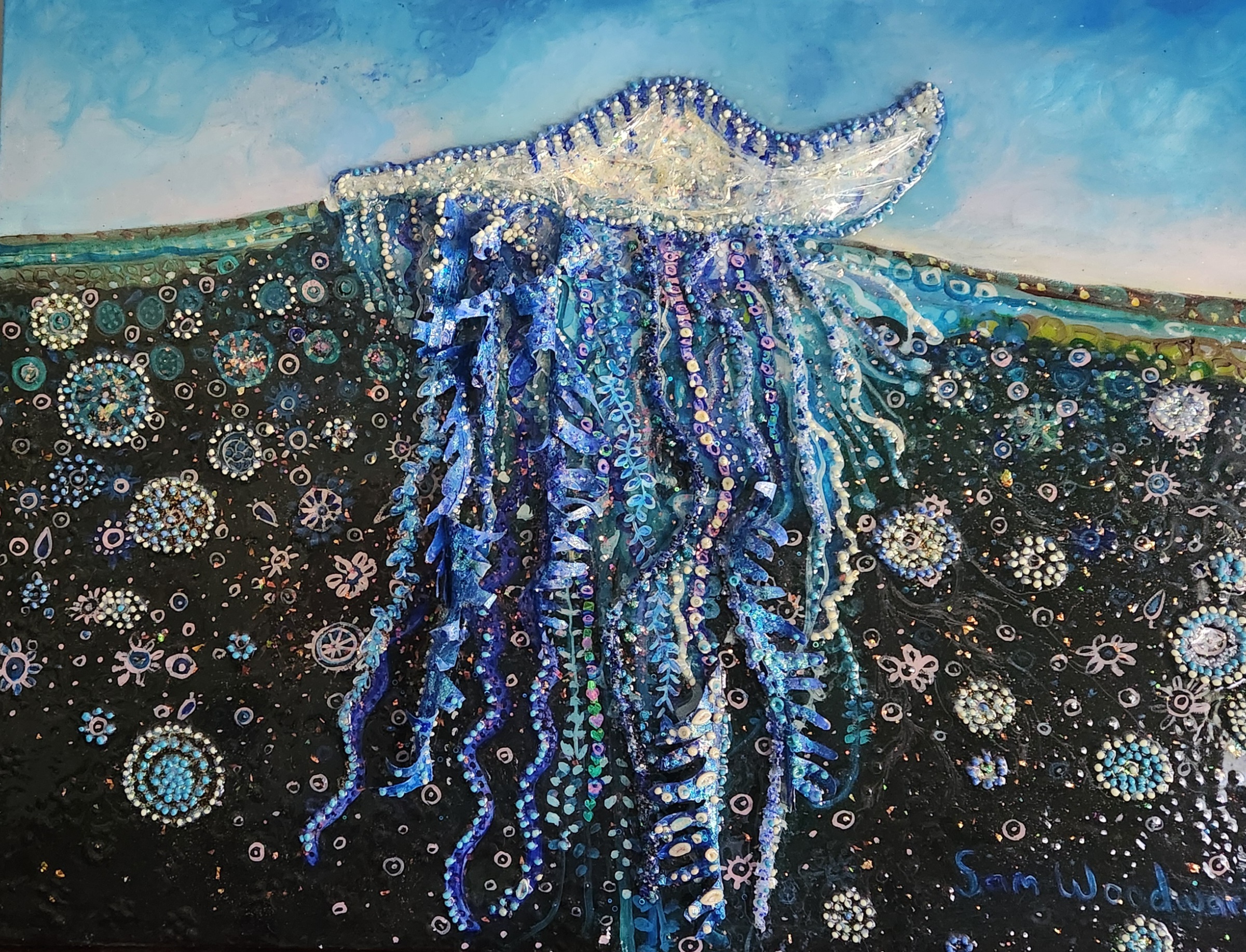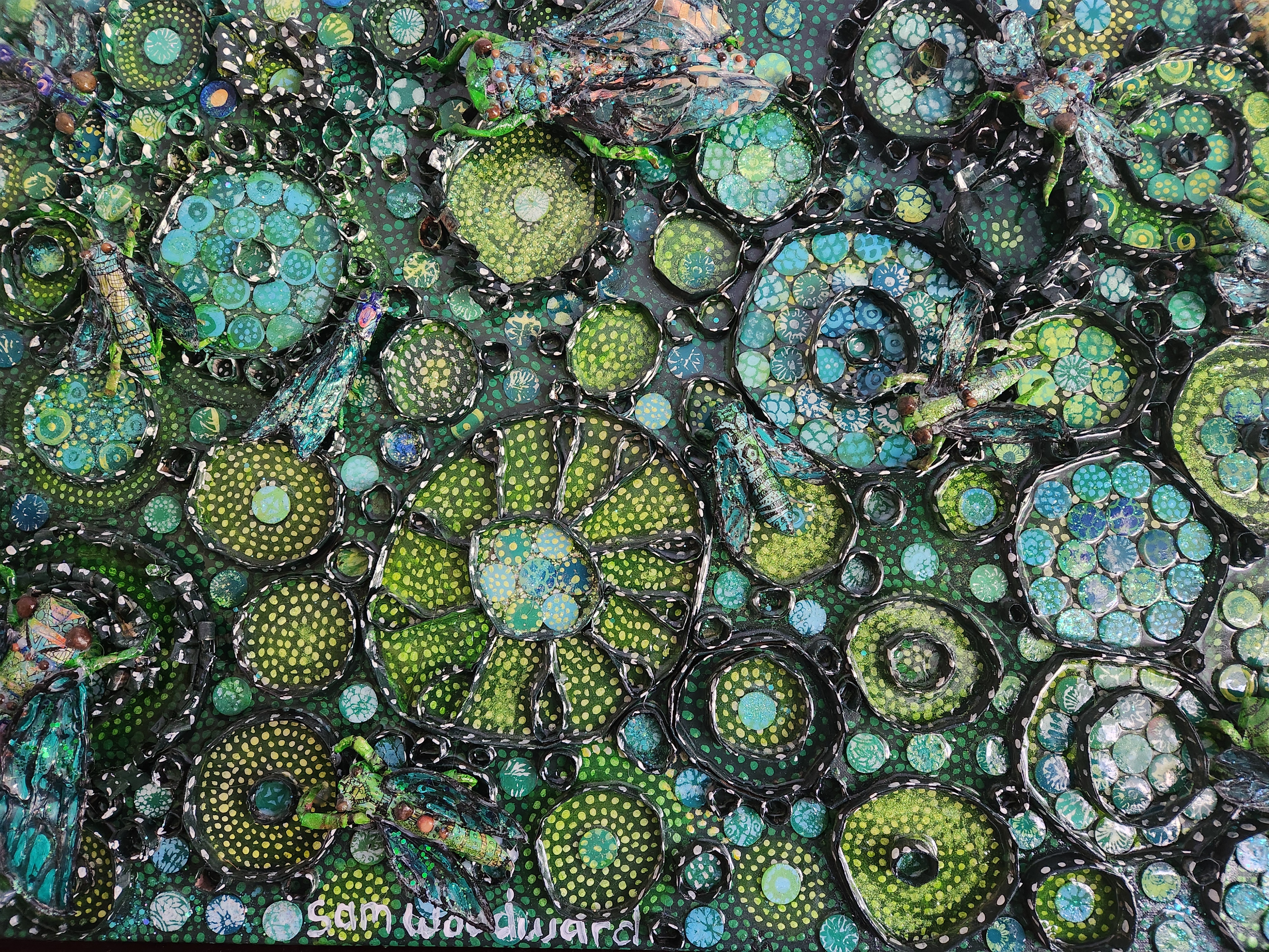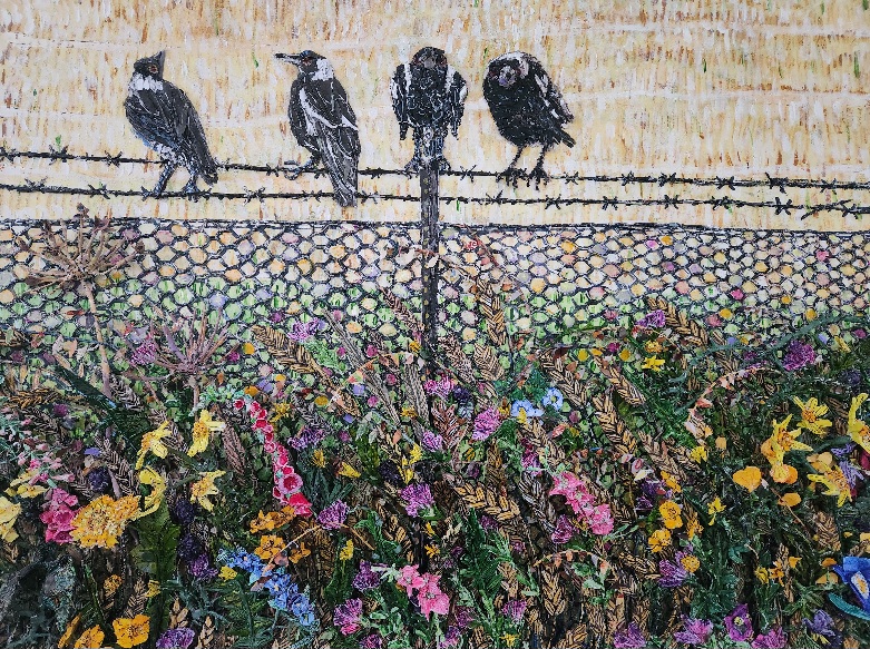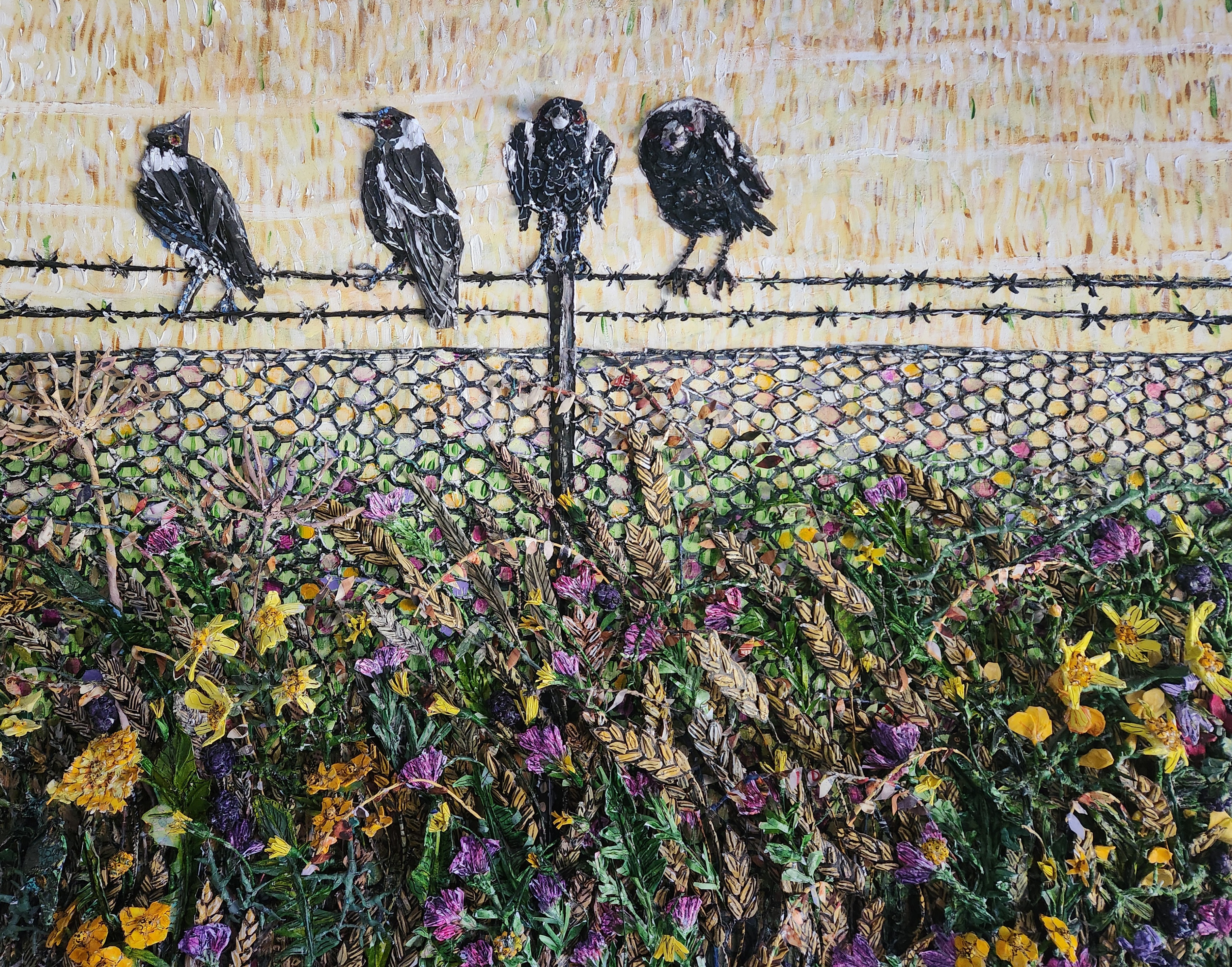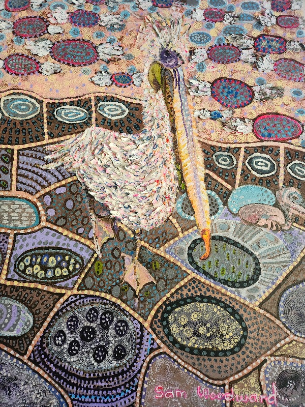 I am inspired by Australian native flora and fauna. The backgrounds of my paintings are aerial views of country.I create layers of depth and pattern within my work and I am inspired to create depth and movement.