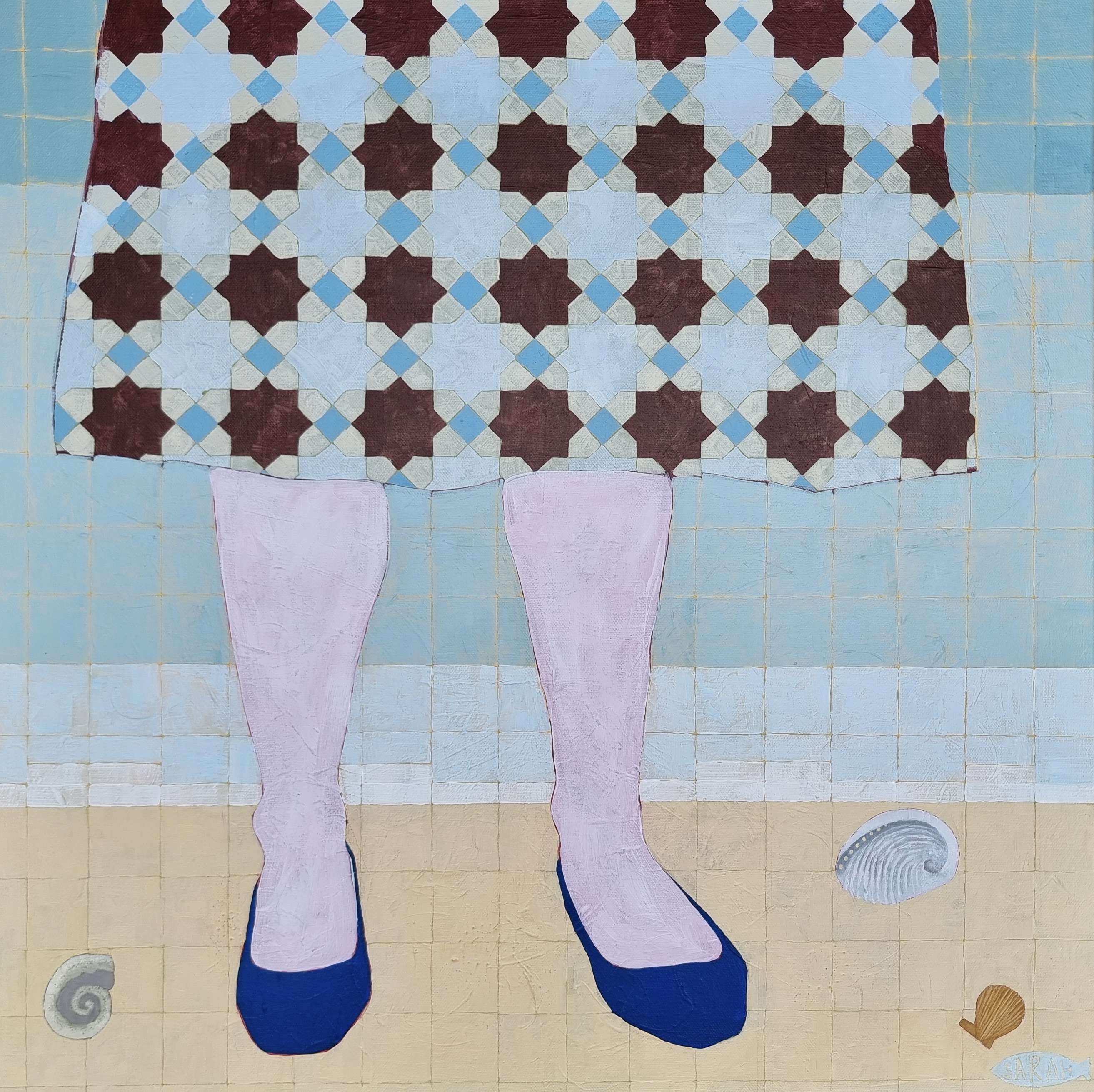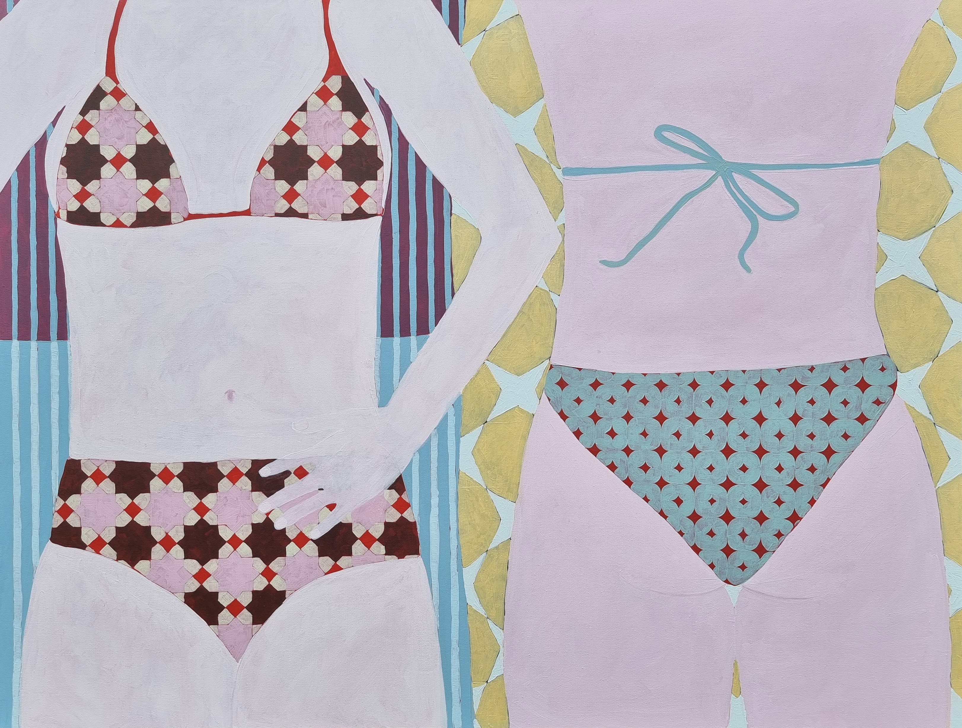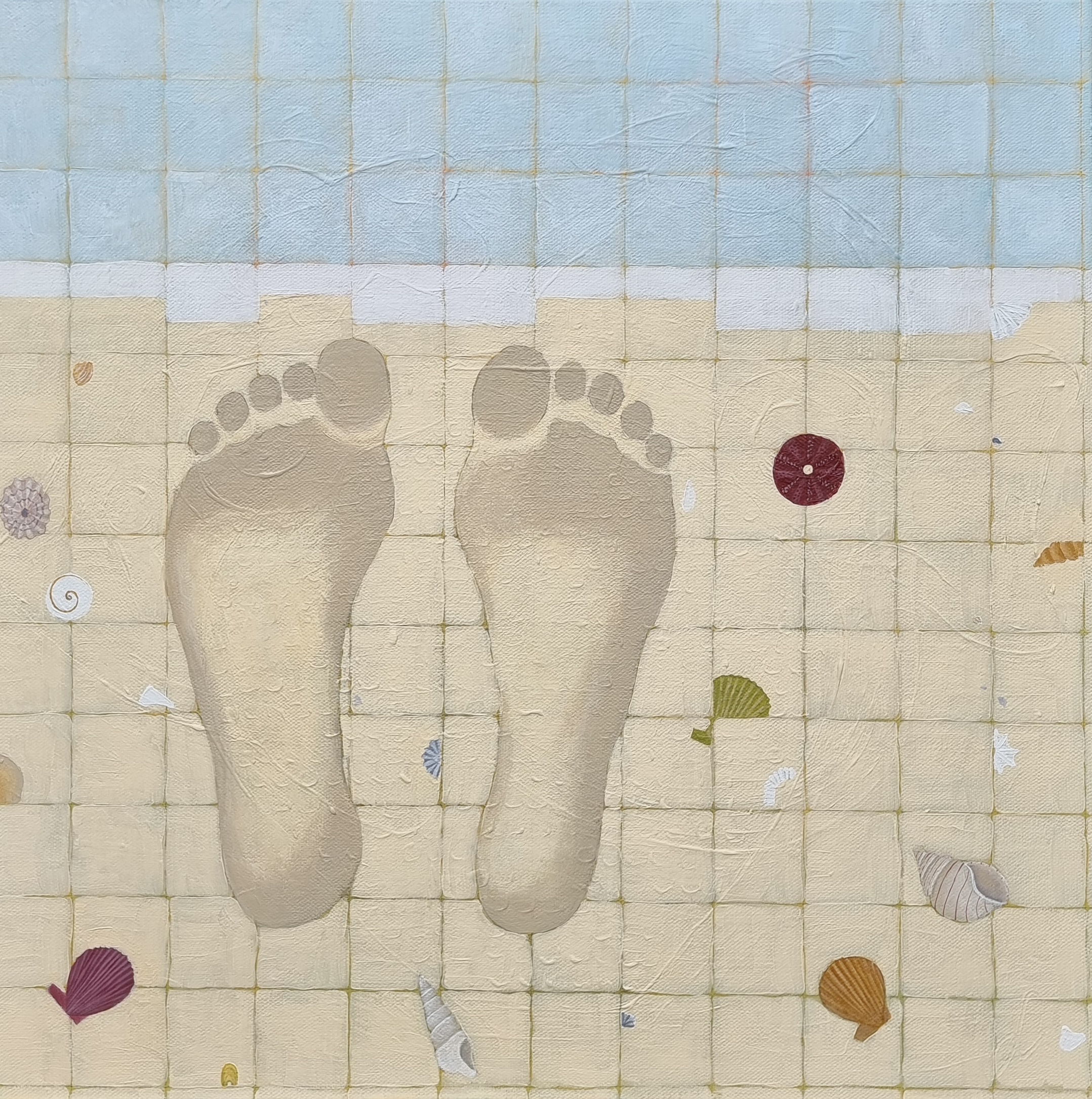 Her creative process begins subconsciously, starting with a feeling which then translates to a vague mental image as the feeling is processed. She chooses colours intuitively and plays with pattern to bring about almost abstract beach scenes. She often reuses canvases, painting a new composition until it feels like it belongs, which builds up organic texture in her work. Her intention is to create works that feel reminiscent, offering a connection between her and those who view her work, a call for kinship. Through her work, she aspires to create pieces that feel like home, allowing space to indulge in sentiment and explore communal memories. Each painting permits her an ever-deepening understanding of her psyche that drives the expansion of her creative practice.