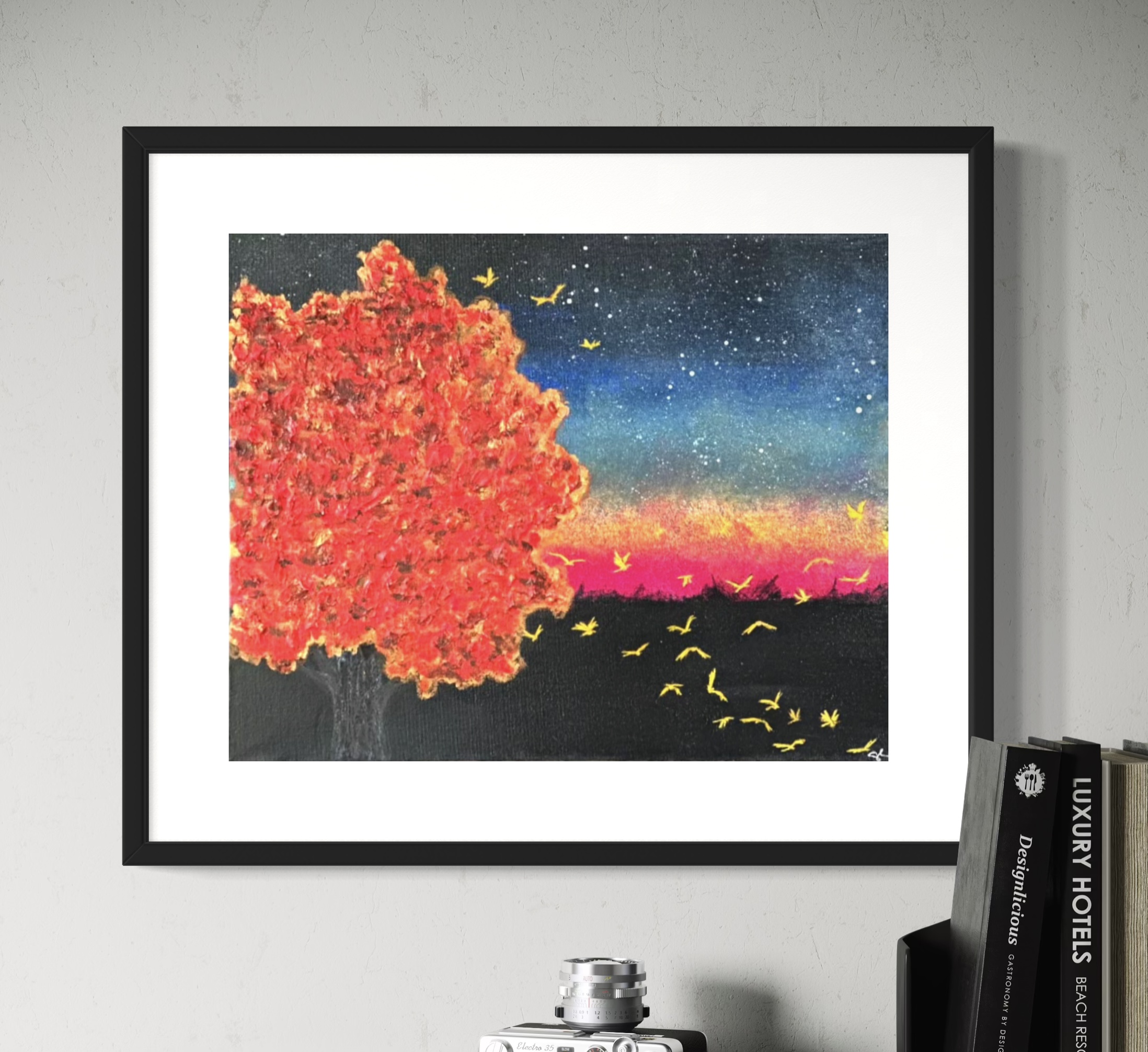 Sharay’s practice is guided by intuition rather than a single genre. Her portfolio includes abstract, impressionistic, realistic, and character-driven pieces, unified by her preference for bold color and expressive mark-making. She primarily works with acrylics, oil pastels, markers, and paste, while continually experimenting with new media and techniques.