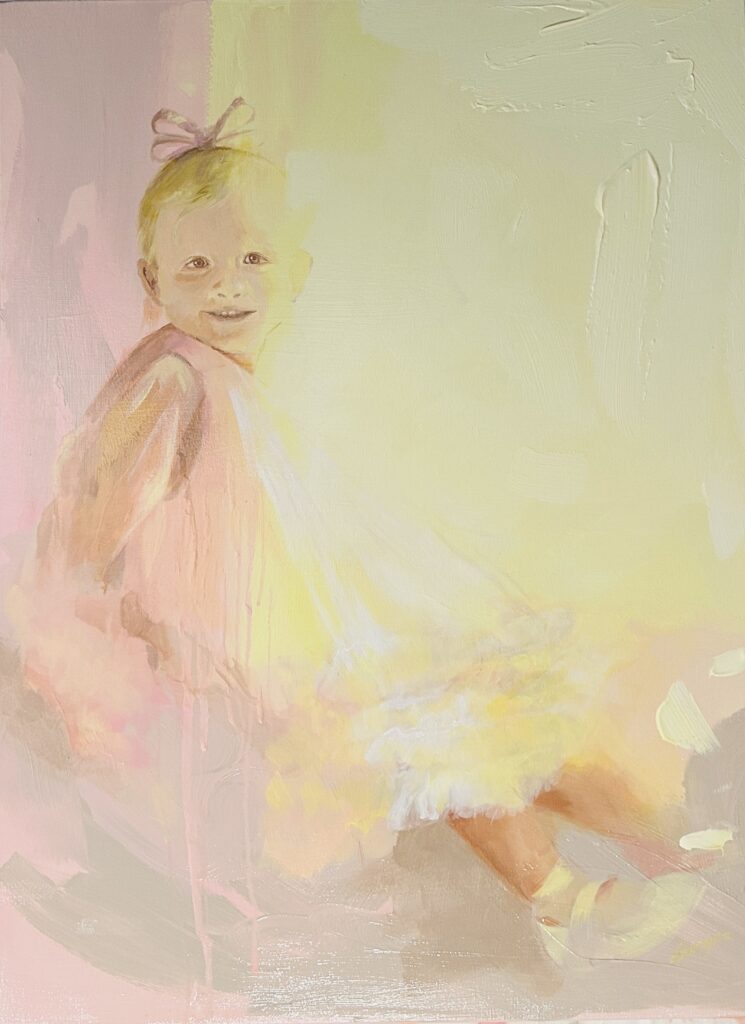 Because somewhere along the way the art world decided that serious means dark. That depth requires weight. That if your work doesn’t challenge or confront or unsettle then it isn’t doing enough. And Lauryna’s entire practice quietly pushes back against that. She paints faces that glow. She fills canvases with warmth and light and space and stillness.