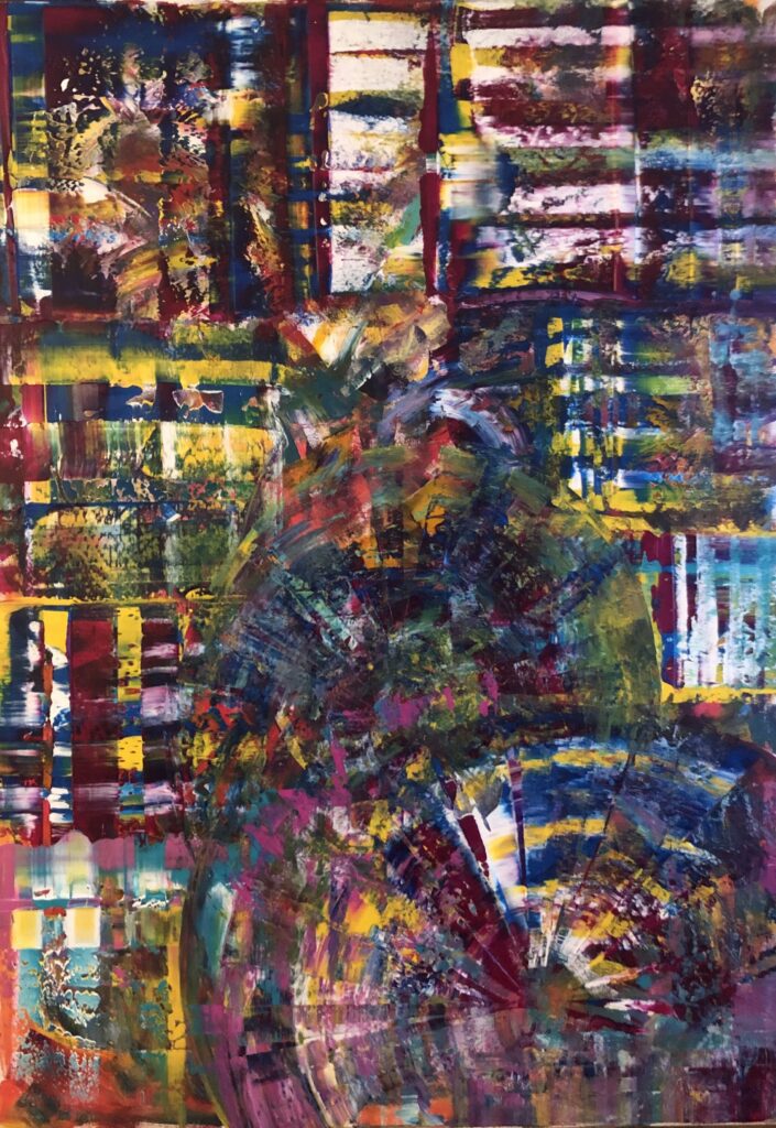 The way she works is strange. She doesn’t use brushes. She uses palette knives and rulers but not the soft artist spatulas. Hard plastic school rulers. The kind that doesn’t bend. There’s something about needing tools that resist, that push back, that won’t just give in to whatever force you’re applying.