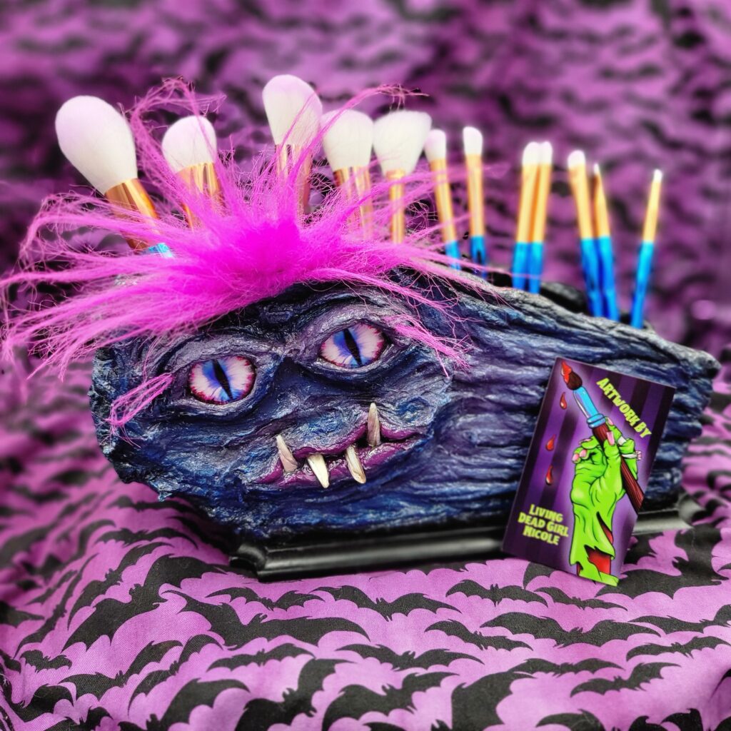 As kids we always have fun idols we want to be like. For me, that was Elvira and Jem. Despite being so different, I was always intrigued by both of them. I loved how Elvira made friends with monsters, was dark and mysterious, and had that unforgettable mix of sex appeal and personality. At the same time, I adored how Jem and her bandmates and rivals didn’t look like everyone else, rocking out with their brightly colored hair and flashy neon clothes. Elvira taught me to embrace the dark, the unusual, and the macabre with confidence, humor, and a splash of dagger blood. Jem showed me the power of bold color, individuality, and self-expression with a dash of glitter. Together, they still influence me by encouraging me to blend contrasting elements…gothic meets whimsy, dark meets playful, strange meets sparkle. Loving two such different icons growing up also reminds me as both an artist and a person that I don’t have to fit into one category. I can explore multiple styles, moods, and aesthetics and, in doing so, make work that is unmistakably mine.